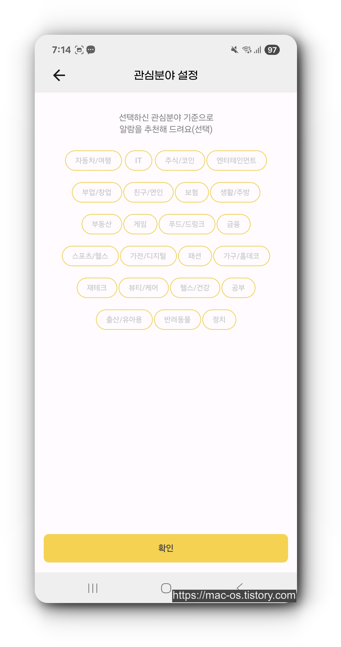 관심분야를 설정하고 확인 버튼을 누르면 회원가입이 완료되고 추천인 코드 입력으로 500원이 적립됩니다.