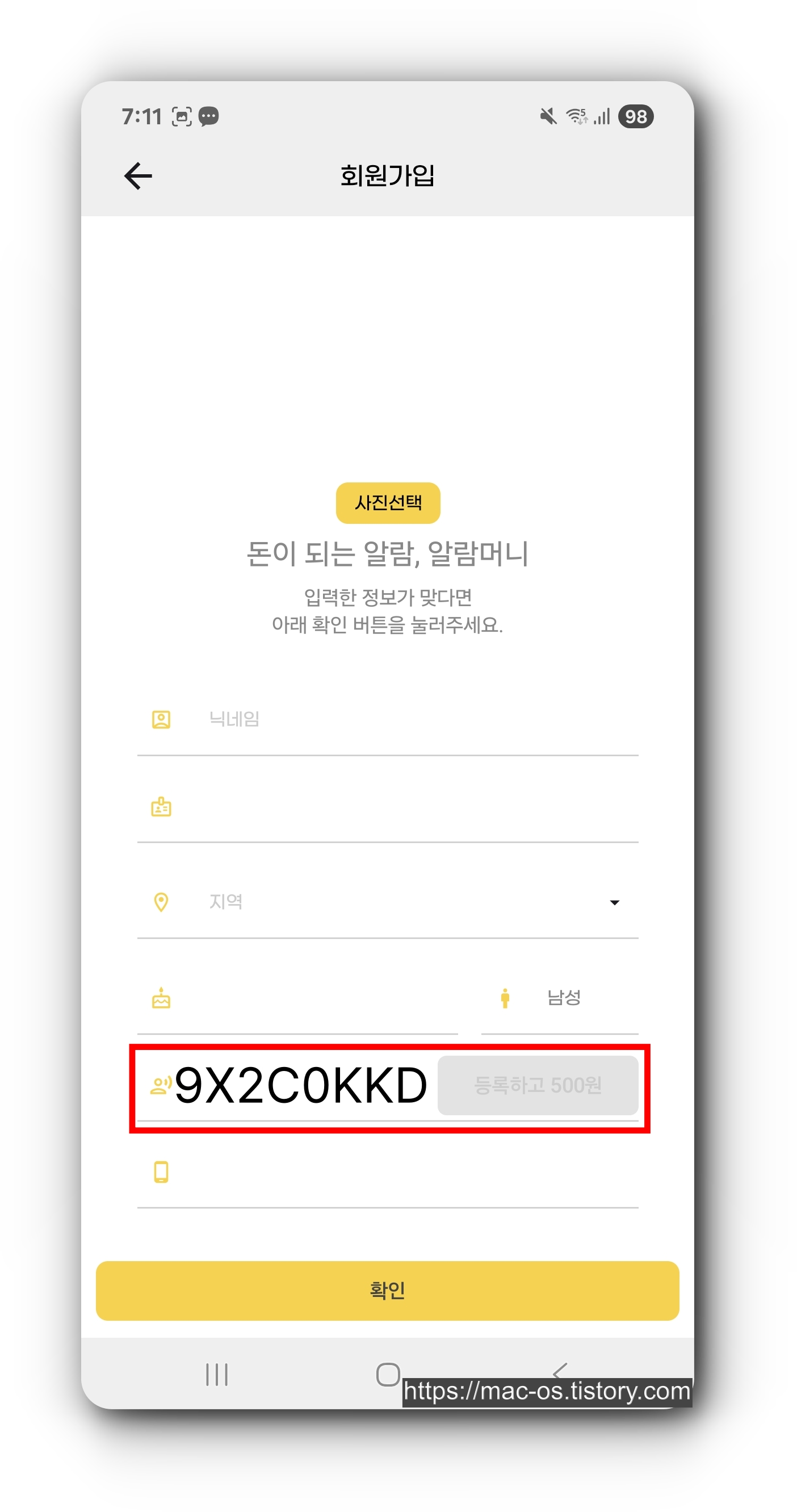 알람머니 닉네임, 지역 등을 입력하는 페이지에서 추천인을 등록할 수 있습니다. 추천인 칸에 9X2C0KKD를 복사해서 입력하면 500원을 받고 시작할 수 있습니다.