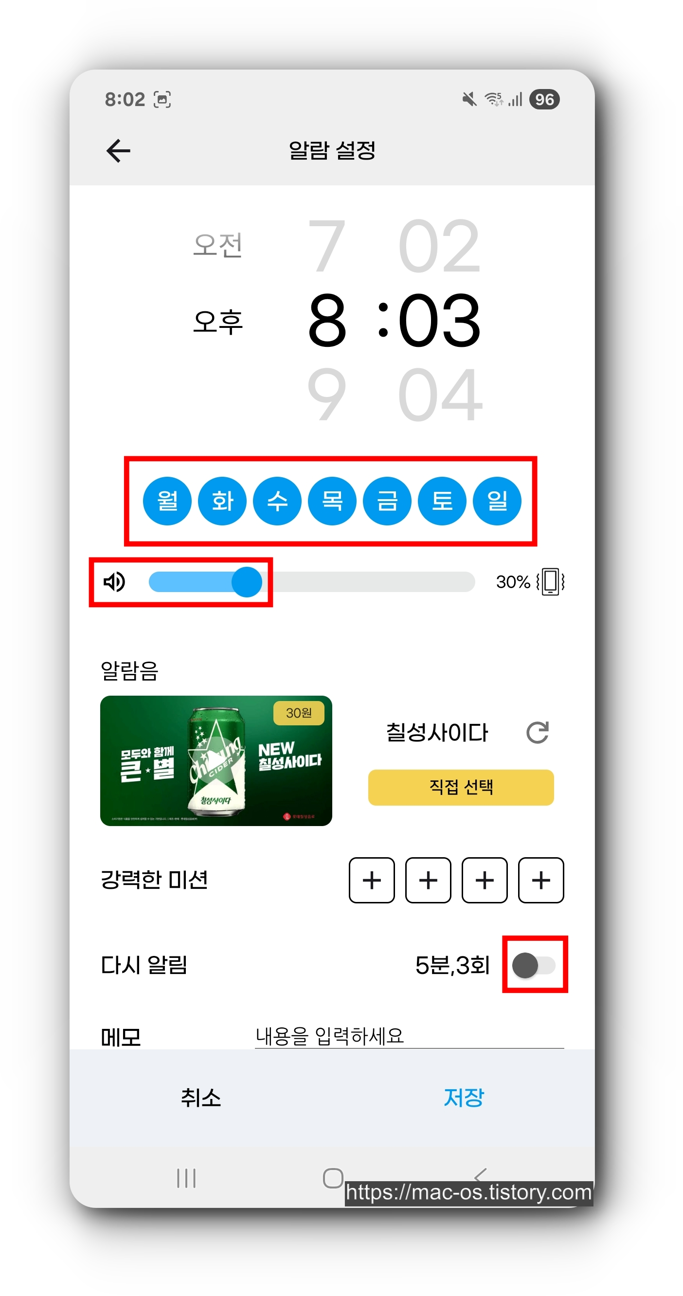 알람머니 앱 사용 방법에 대해 살펴보겠습니다. 우선 앱에서 [알람 맞추러 가기] 버튼을 눌러 알람을 설정합니다. 여기서 월/화/수/목/금/토/일 모든 요일을 설정하고 소리를 100%에서 30%로 낮춥니다. 그리고 [다시 알림]을 체크해서 5분, 3회를 설정하면 좋습니다.