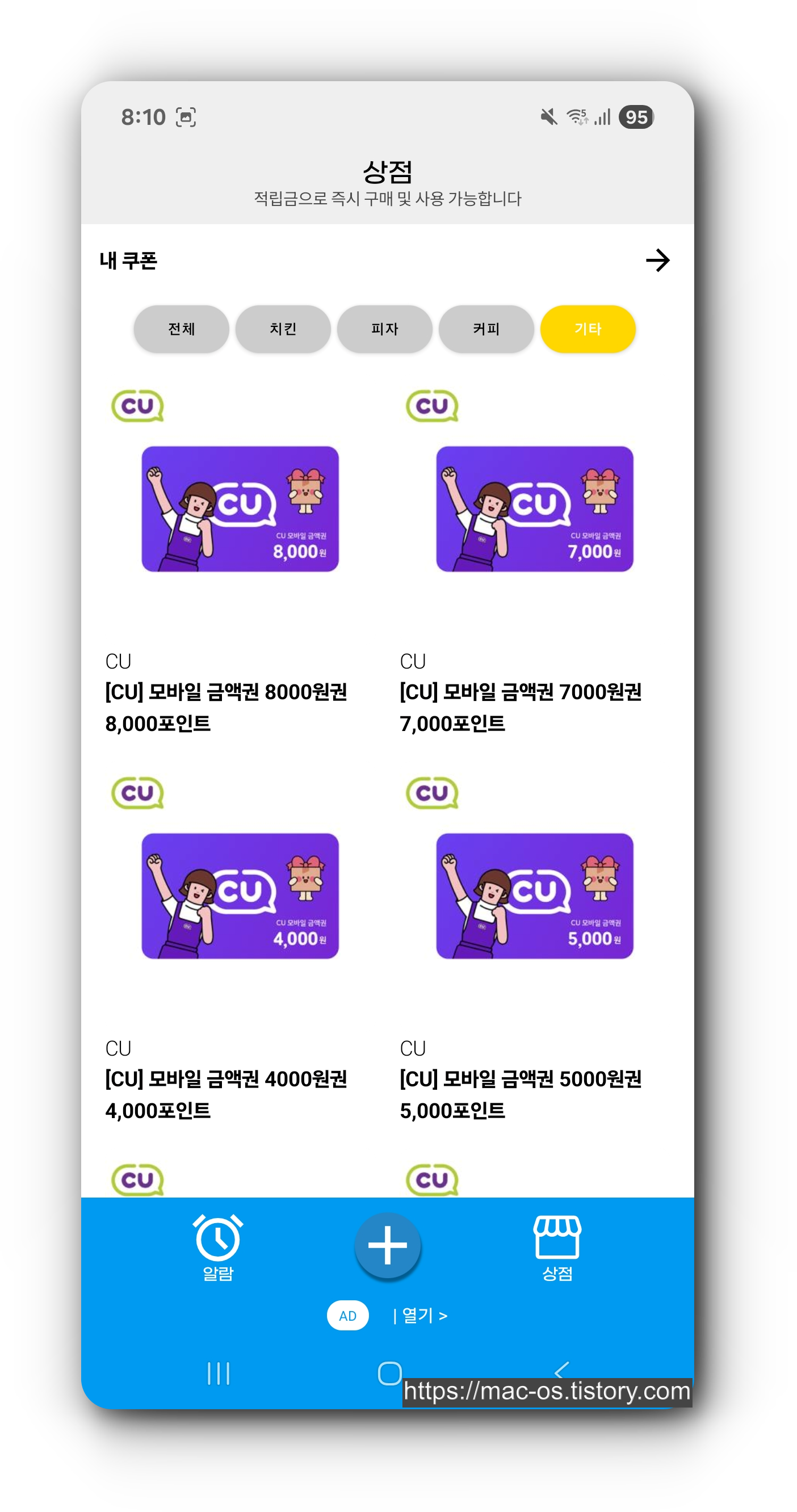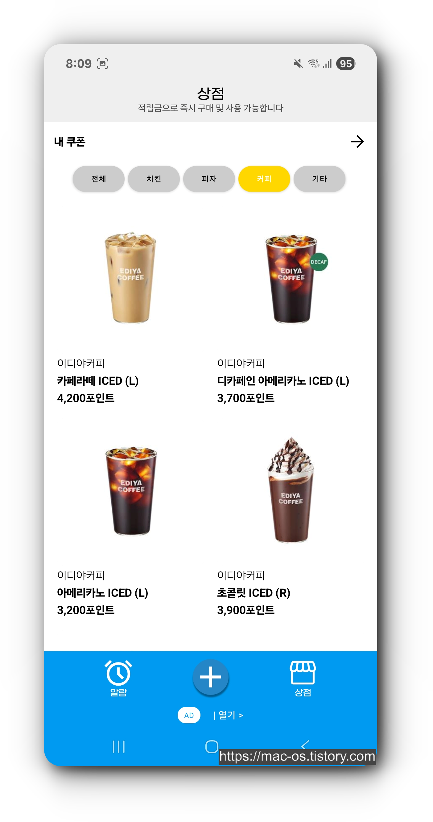 알람머니에서 얻은 포인트는 상점에서 이디야커피 카페라떼, CU 모바일 금액권 등 기프티콘을 1:1 비율로 구매하여 사용할 수 있습니다.