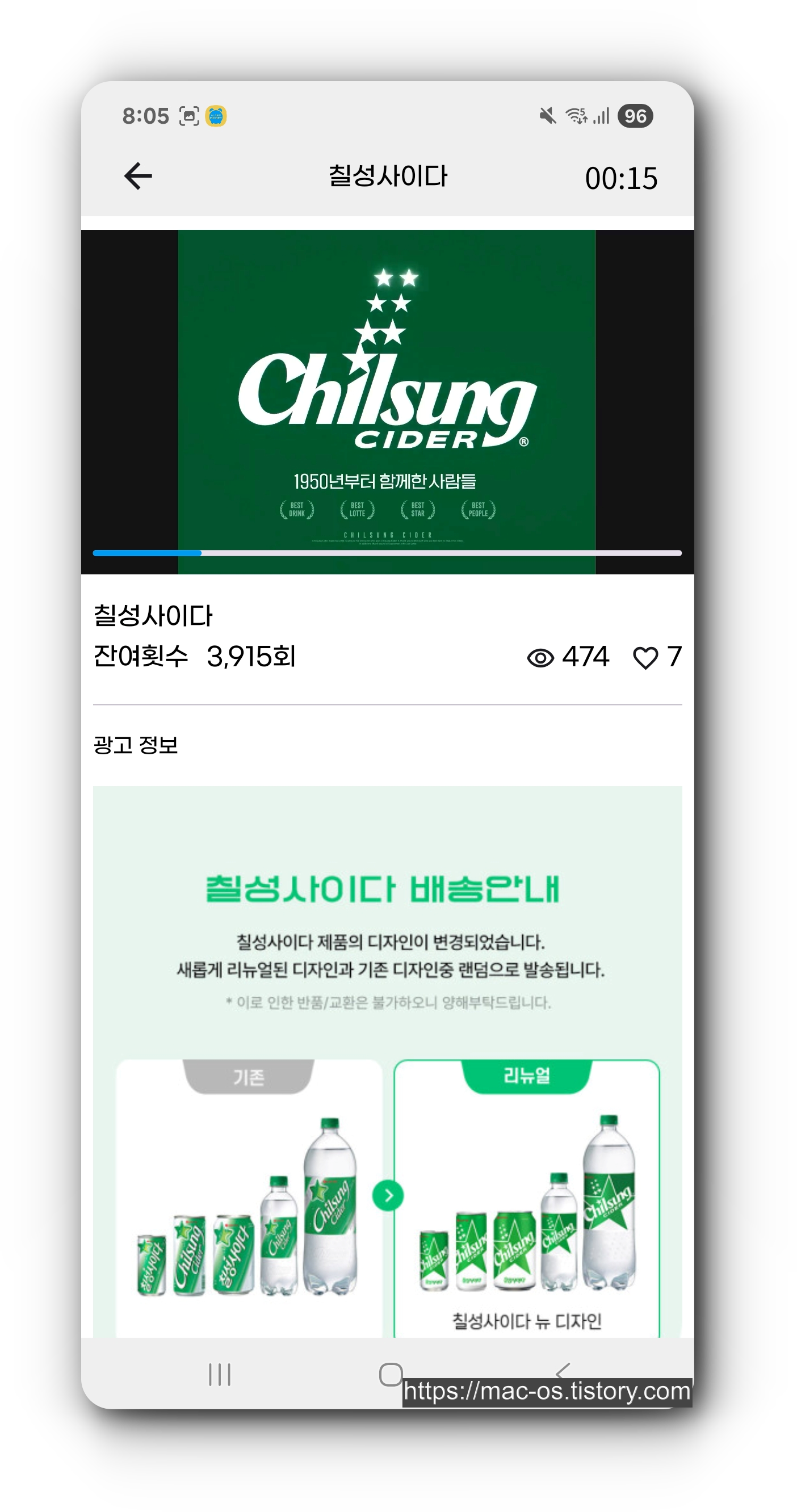그런데 화면 아래에 있는 광고 정보를 스크롤하면서 읽어야 영상이 재생되며 만약 오른쪽 화면에서 터치하지않고 휴대폰을 가만히 내버려두면 영상이 정지됩니다. 그래서 브랜드관 버튼을 누르지 않고 이전 광고 영상 페이지에서 가만히 내버려두는게 더 좋습니다. (이러면 소리는 끌 수 없음)