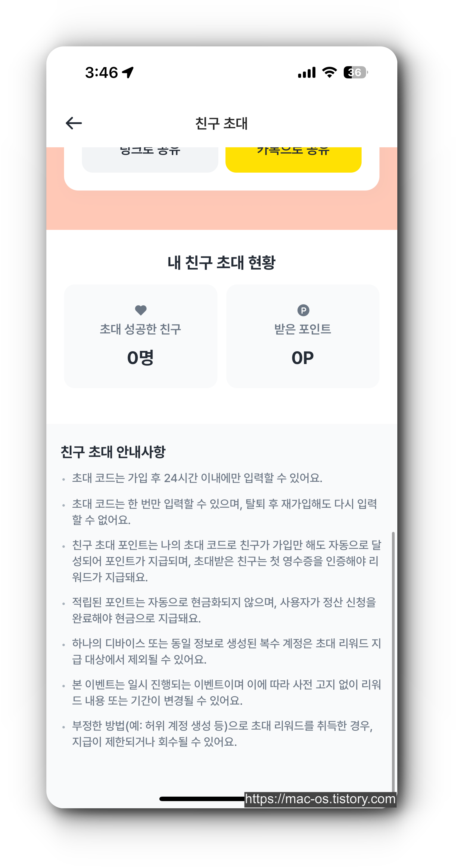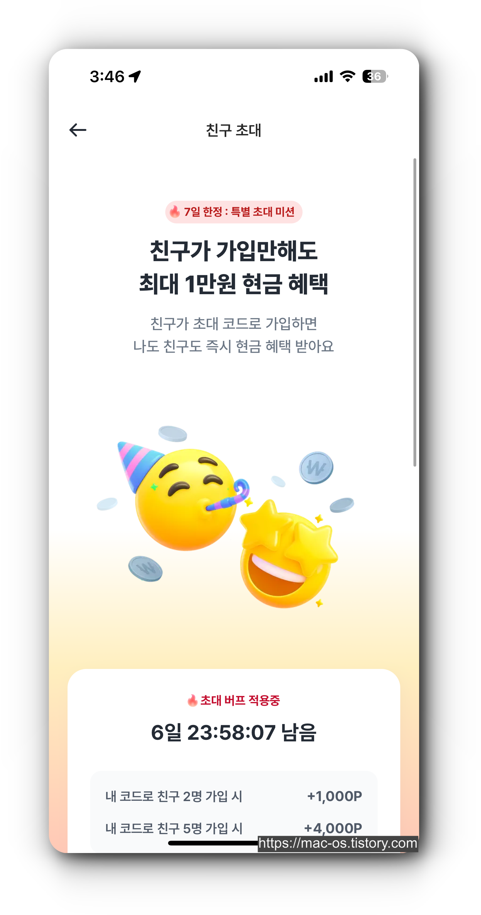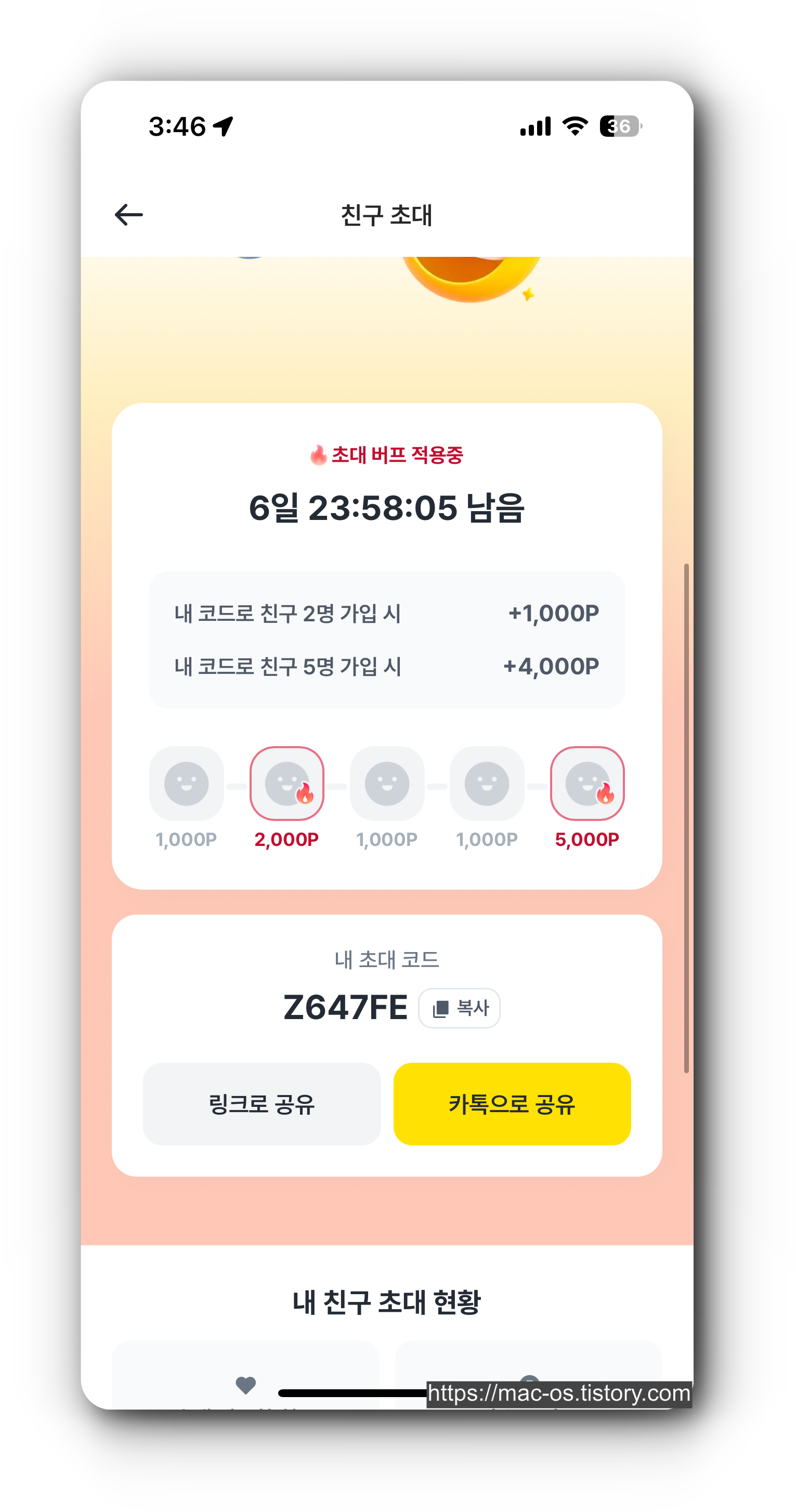 튜토리얼을 마치면 초대코드 입력창이 나옵니다. 여기서 Z647FE를 입력하면 700포인트를 받을 수 있습니다.