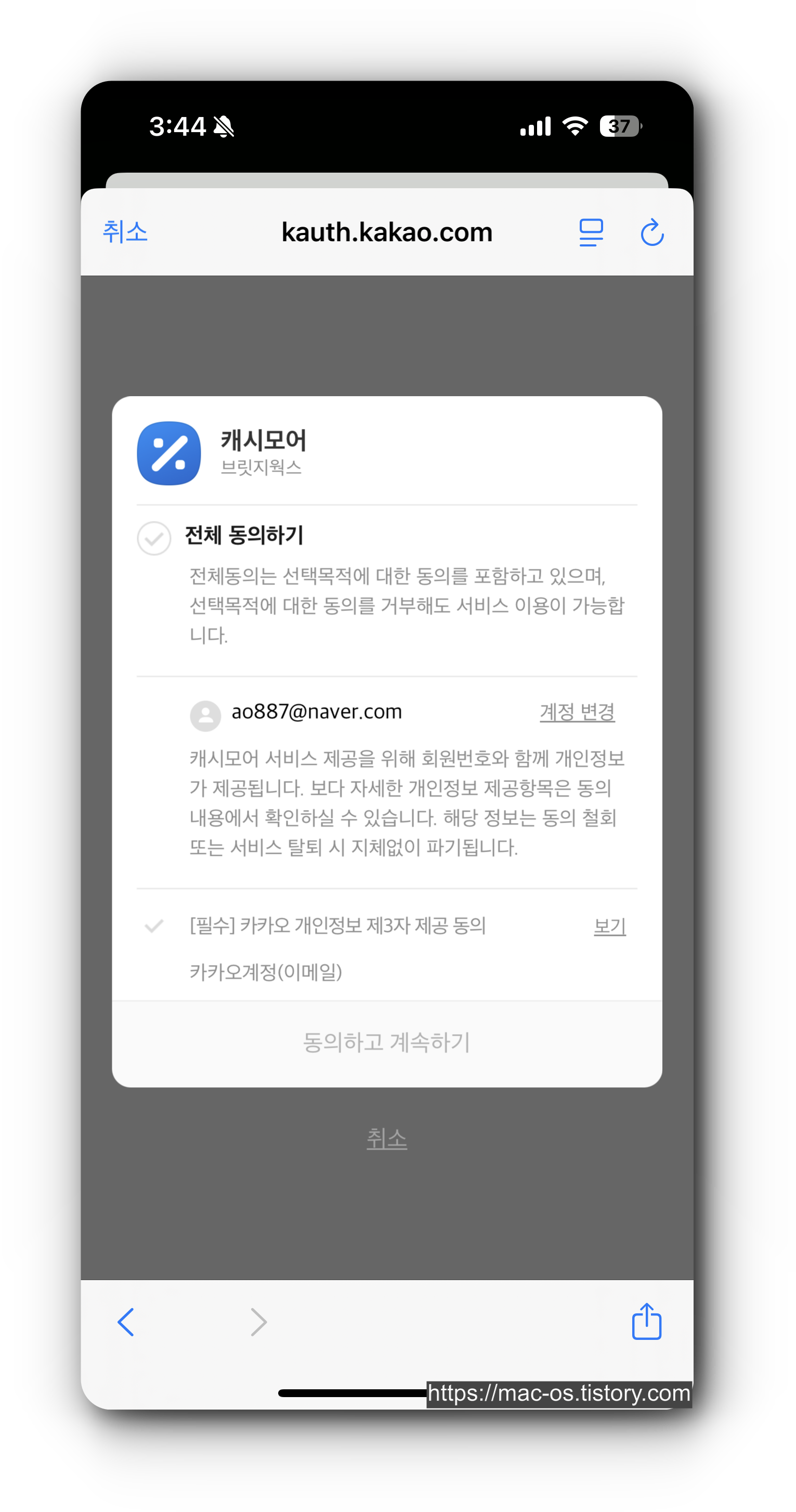 저는 카카오 계정으로 로그인했고, 로그인 후 약관에 동의했습니다.