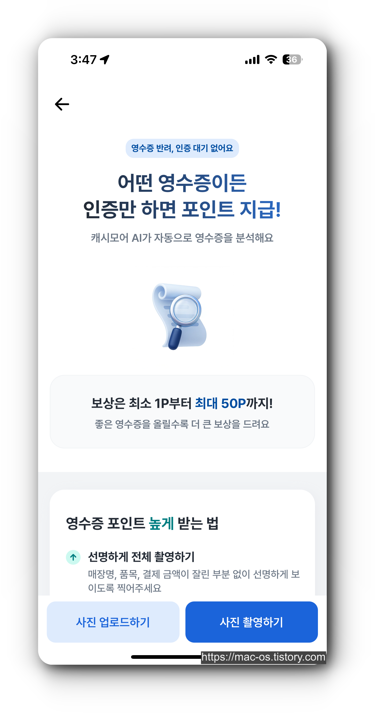 캐시모어에서 영수증을 촬영하는 방법은 홈 화면에서 영수증 인증 페이지로 이동해서 [사진 촬영하기] 버튼을 터치하면 됩니다.