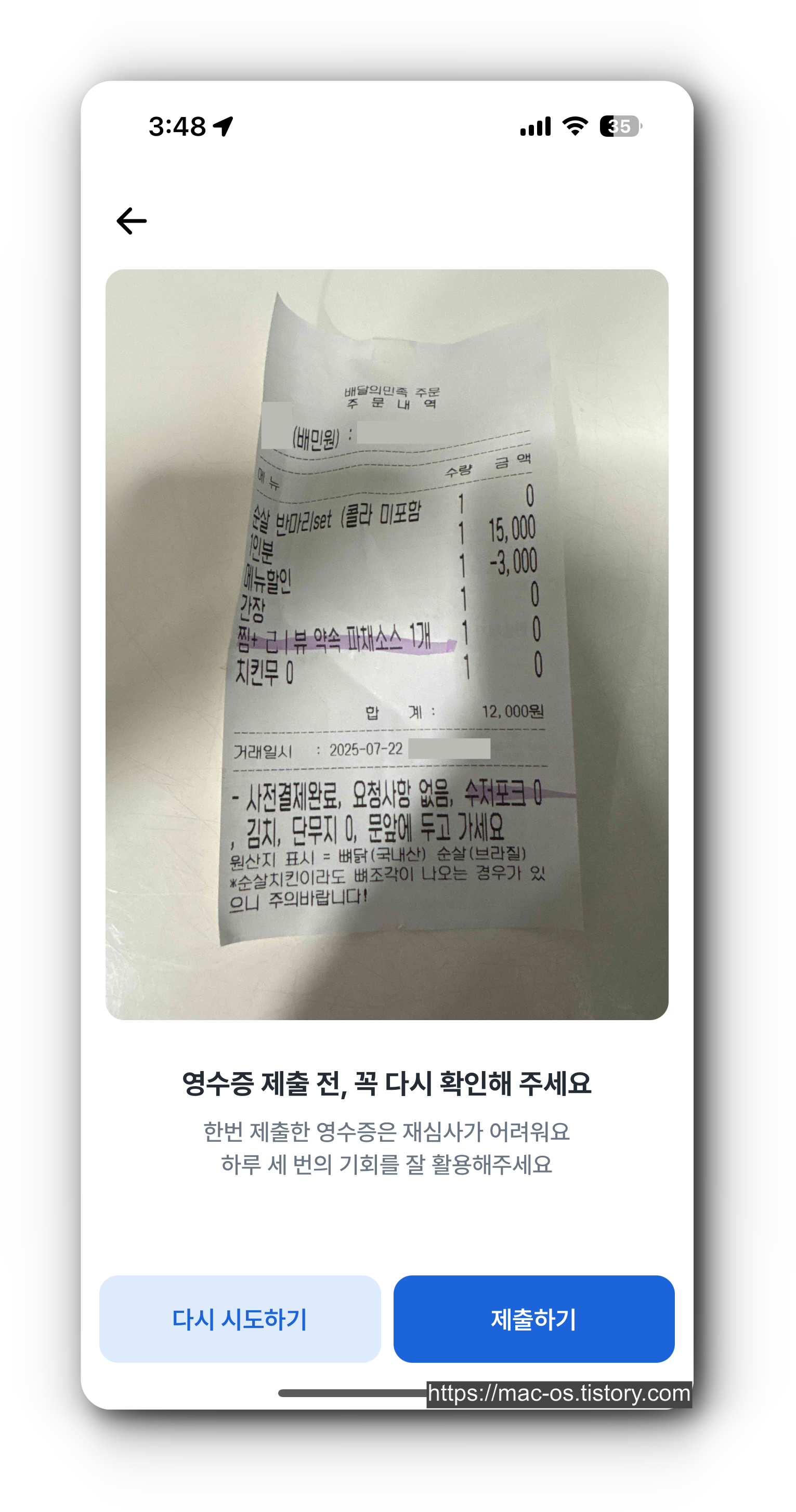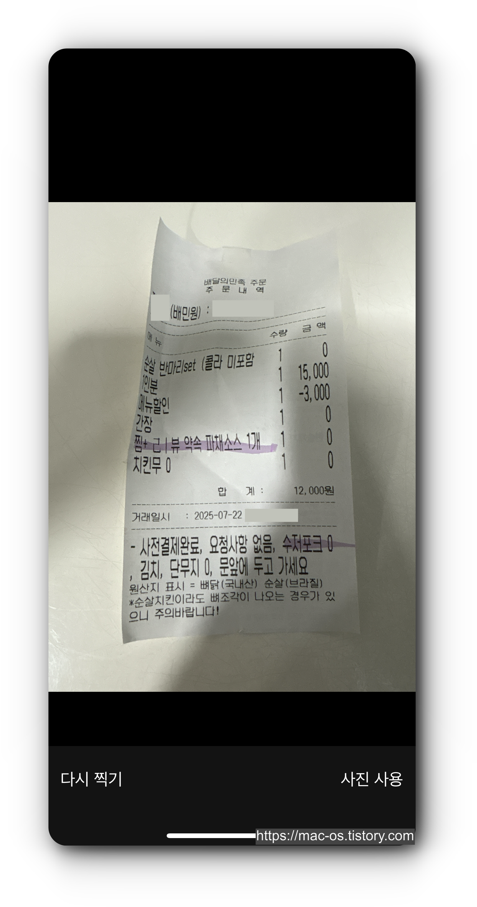 이렇게 배달의민족 영수증을 찍어서 제출해봤습니다.