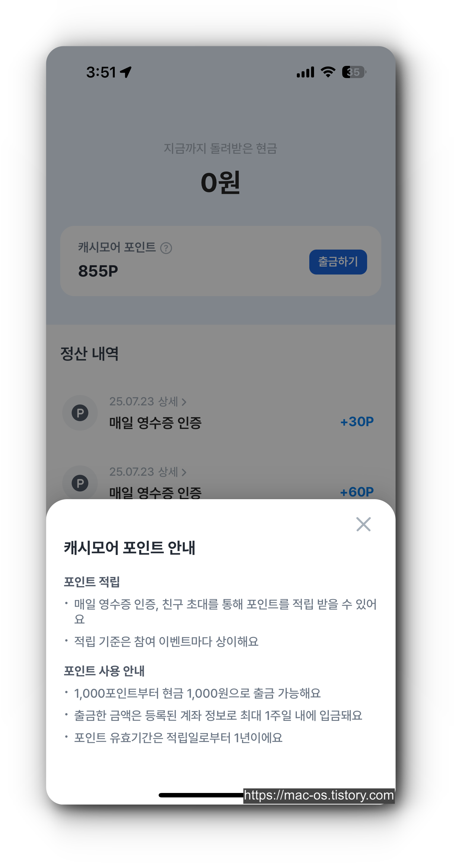 캐시모어에서 영수증 촬영이나 쿠팡 방문 등을 통해 얻은 포인트는 1000포인트부터 현금 1000원으로 출금이 가능하고, 최대 1주일 내에 입금됩니다. 포인트 유효기간은 적립일로부터 1년입니다.