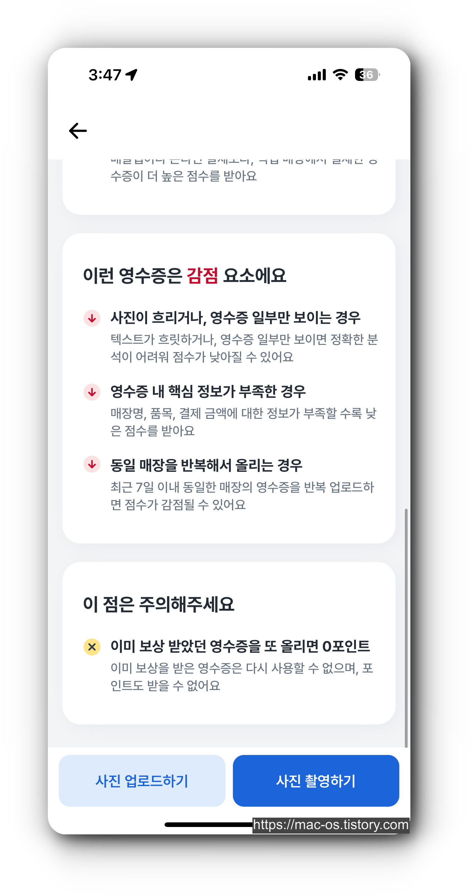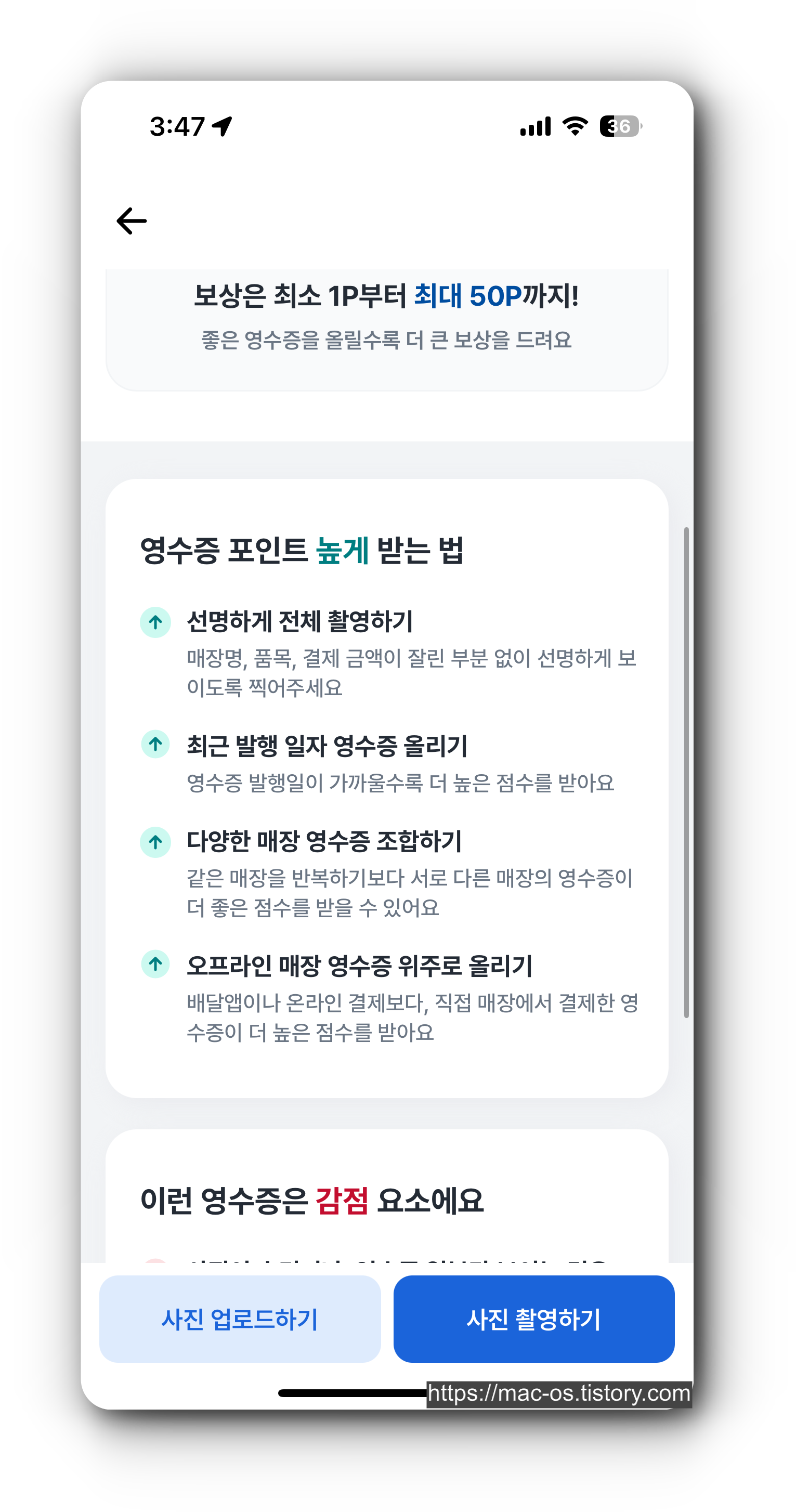 배달앱이나 온라인 결제보다 직접 매장에서 결제한 영수증이 더 높은 점수를 받습니다. 그리고 최근 7일 이내 동일한 매장의 영수증을 반복 업로드하면 점수 감점 요인이 됩니다.