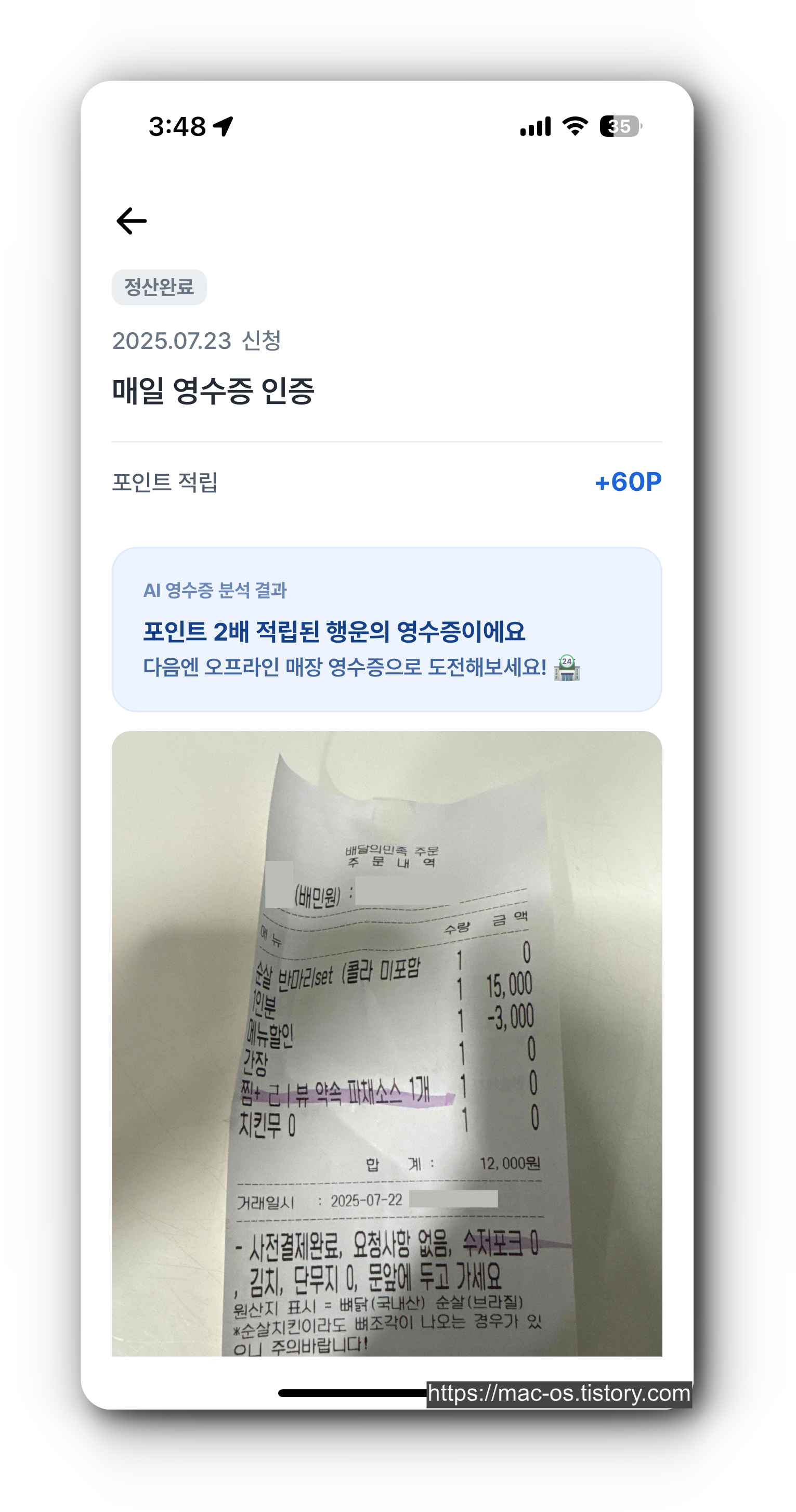 그럼 AI가 사진을 분석해서 점수를 측정하고 포인트를 주는데, 저는 60P를 받았는데 이건 2배 버프를 받은거라서 30P를 받은거라고 보면 됩니다. 편의점이나 마트, 음식점 영수증 등 오프라인 매장의 경우 더 높은 점수를 받아서 포인트를 더 줄 수도 있습니다.