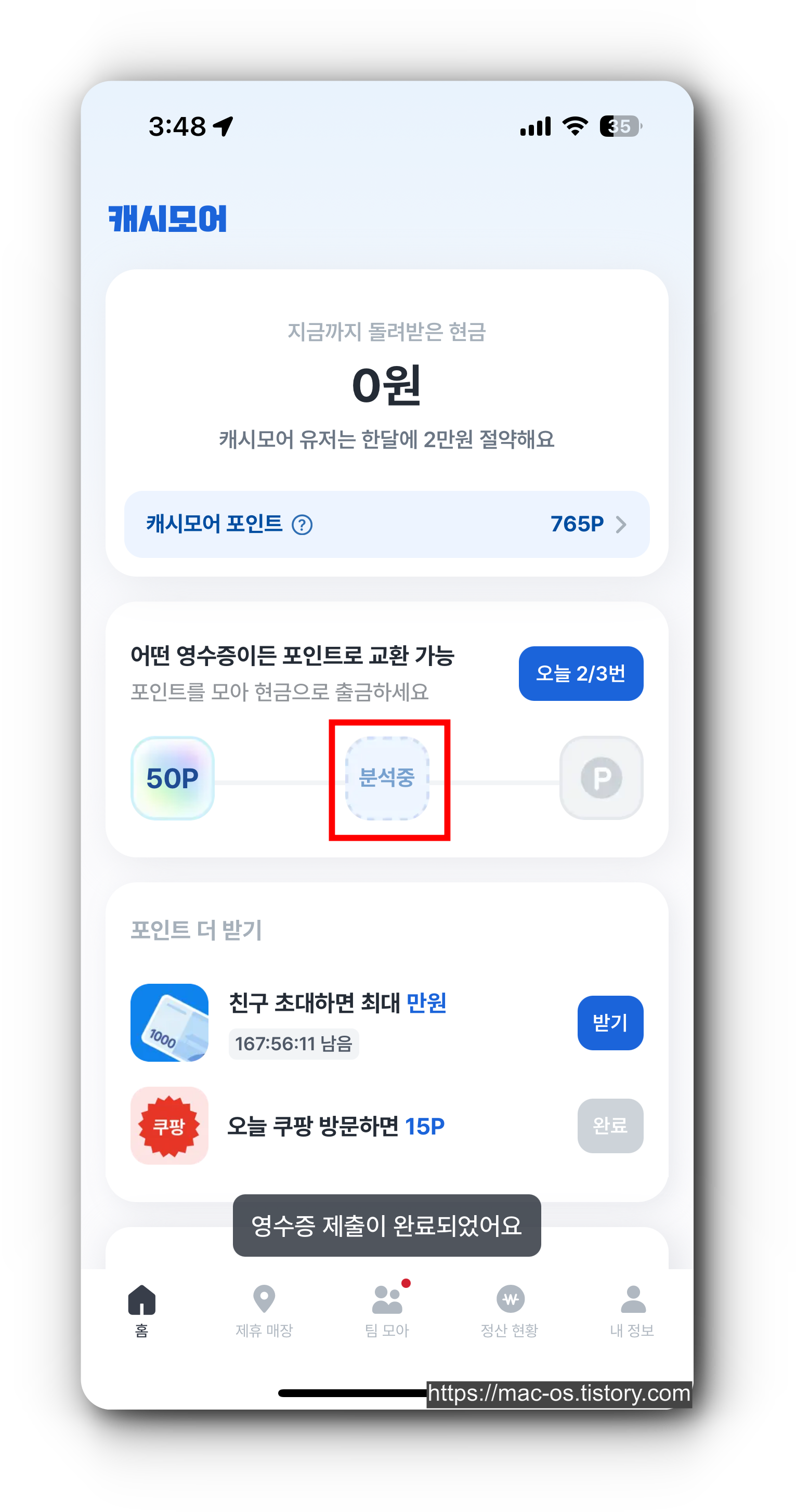 - 영수증 촬영은 하루에 3번 가능하고, 광고 영상을 시청하면 촬영 가능 횟수를 늘릴 수 있음, 적립받은 포인트 비율은 1:1, 계좌로 현금 출금하는 방식