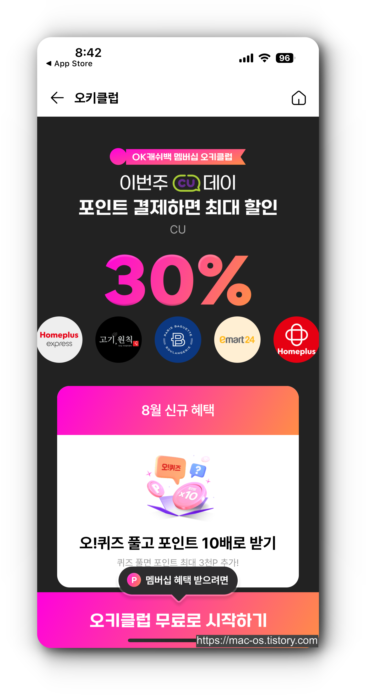 오키클럽이란 OK캐쉬백의 새로운 멤버십으로 OK캐쉬백 포인트로 제휴 매장에서 결제 시, 오데이인 목요일에는 30%, 상시 5% 할인 혜택을 받을 수 있습니다.