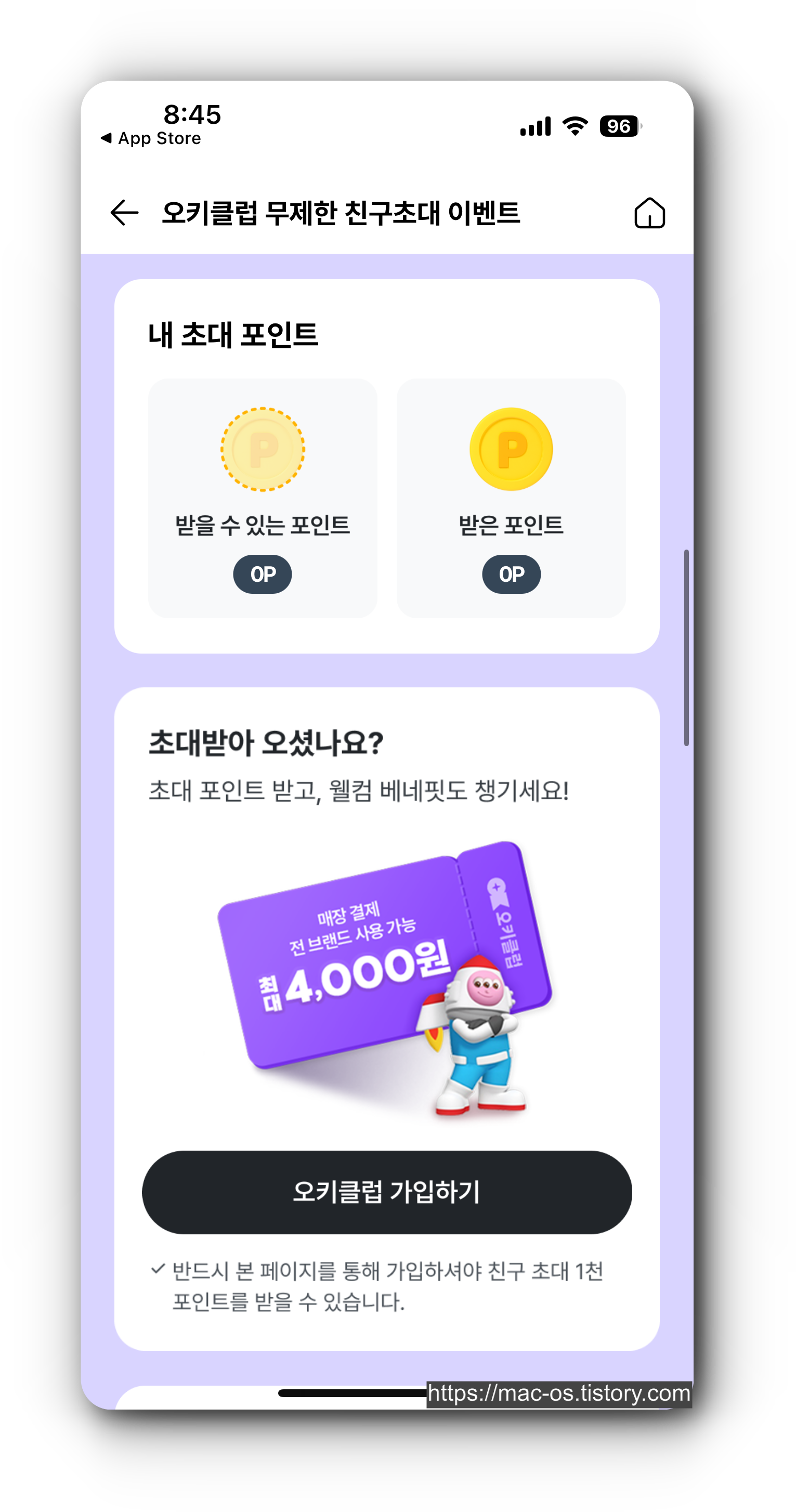 - 친구를 초대한 사람과 초대받아 가입한 회원은 모두 OK캐쉬백 1000포인트를 받을 수 있음