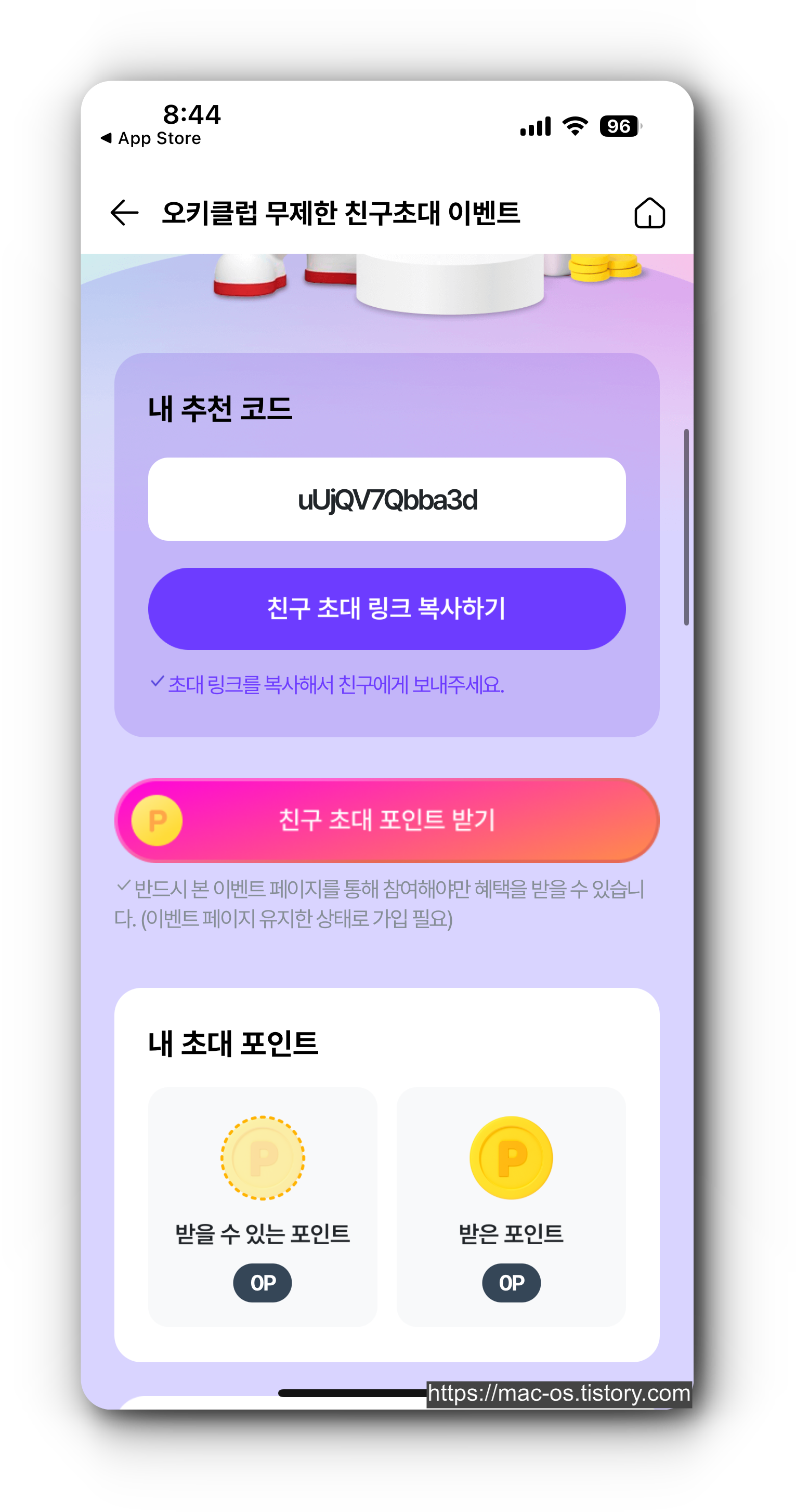 친구초대 이벤트 페이지에서 친구 초대 링크와 내 추천 코드를 복사할 수 있습니다. 신규 가입한 회원 및 친구를 초대한 기존 회원은 [친구 초대 포인트 받기] 버튼을 눌러 포인트를 수령해야 합니다.