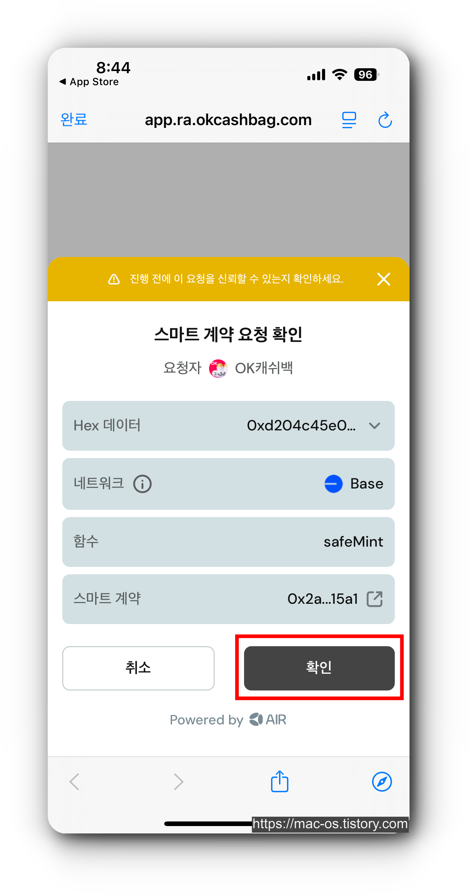 14. 스마트 계약 요청 확인 창에서 [확인] 터치