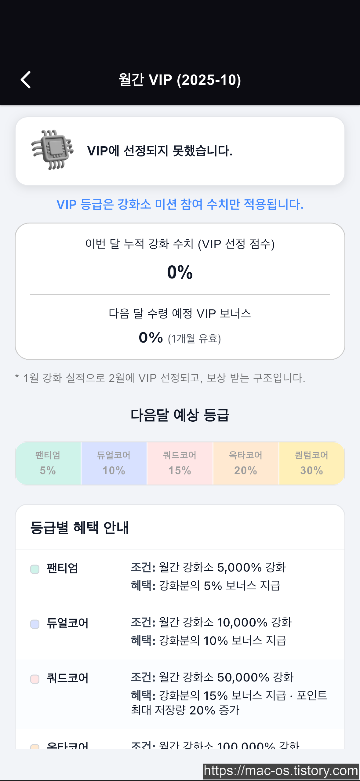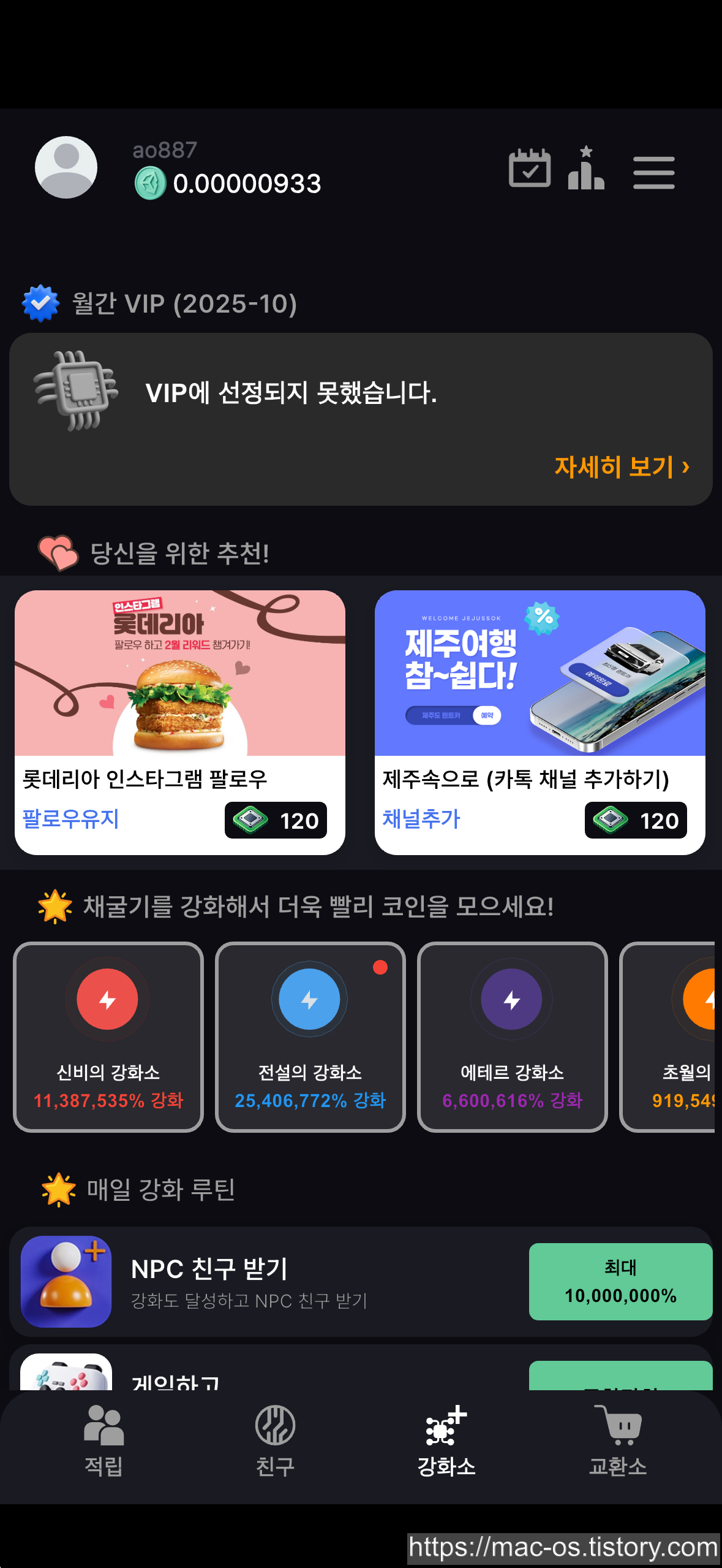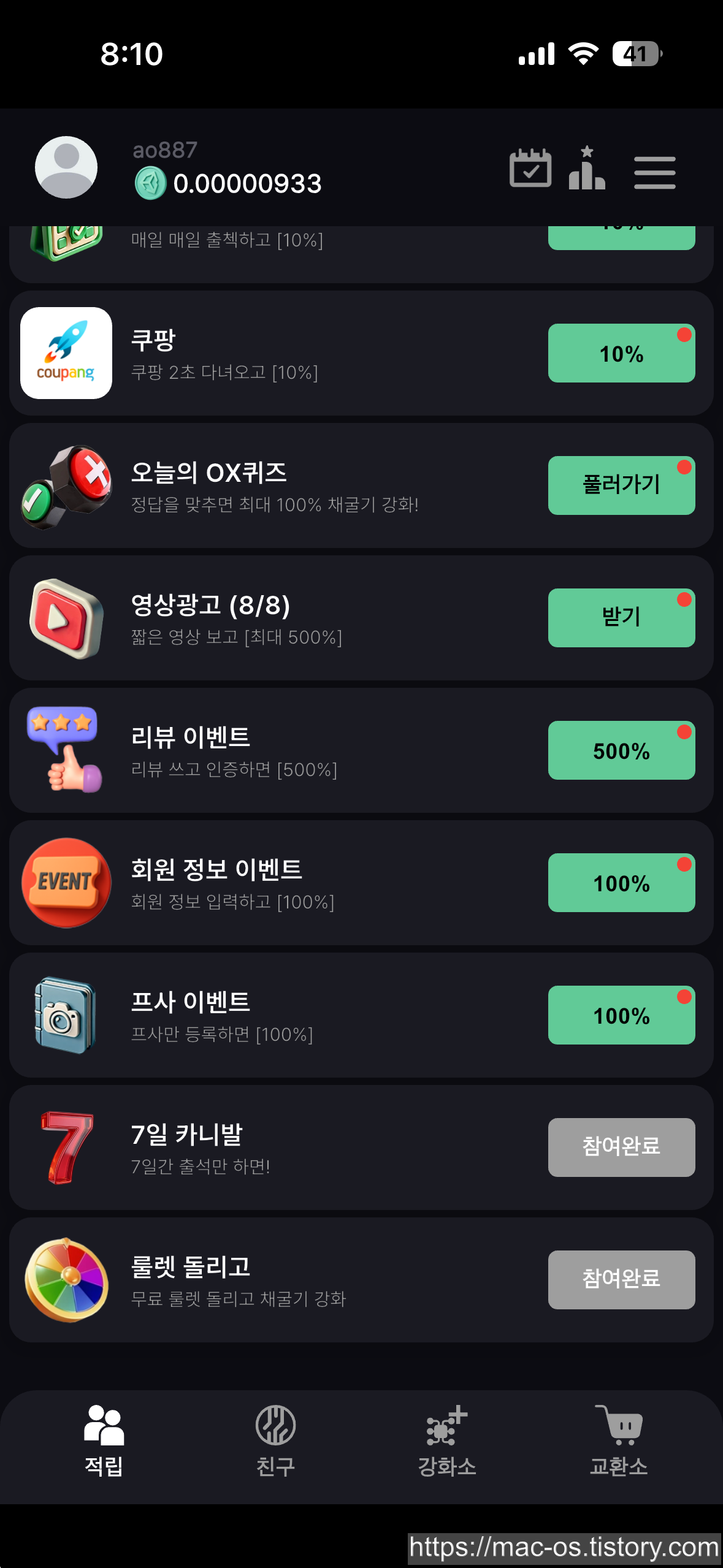 강화소 페이지에서 여러 광고 충전소에 들어가 광고 미션에 참여하면 보상으로 채굴속도가 증가하게 됩니다. 강화소 미션 참여 수치에 따라 등급이 달라지며, 높은 등급이 되면 그에 따라 좋은 혜택을 받습니다.