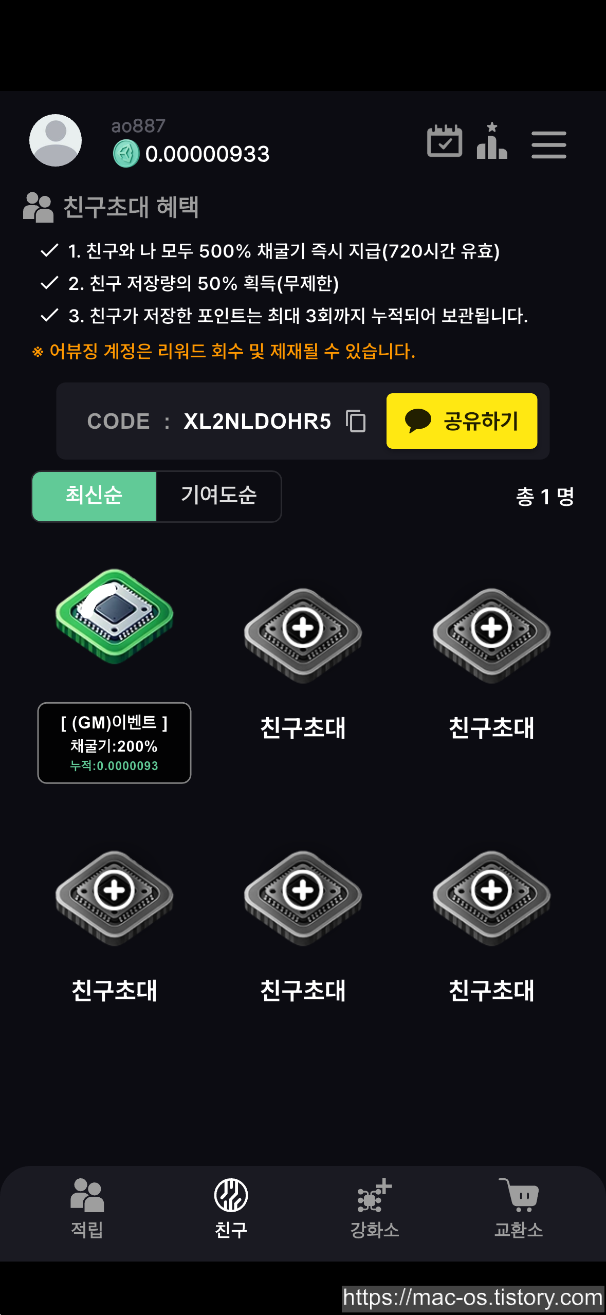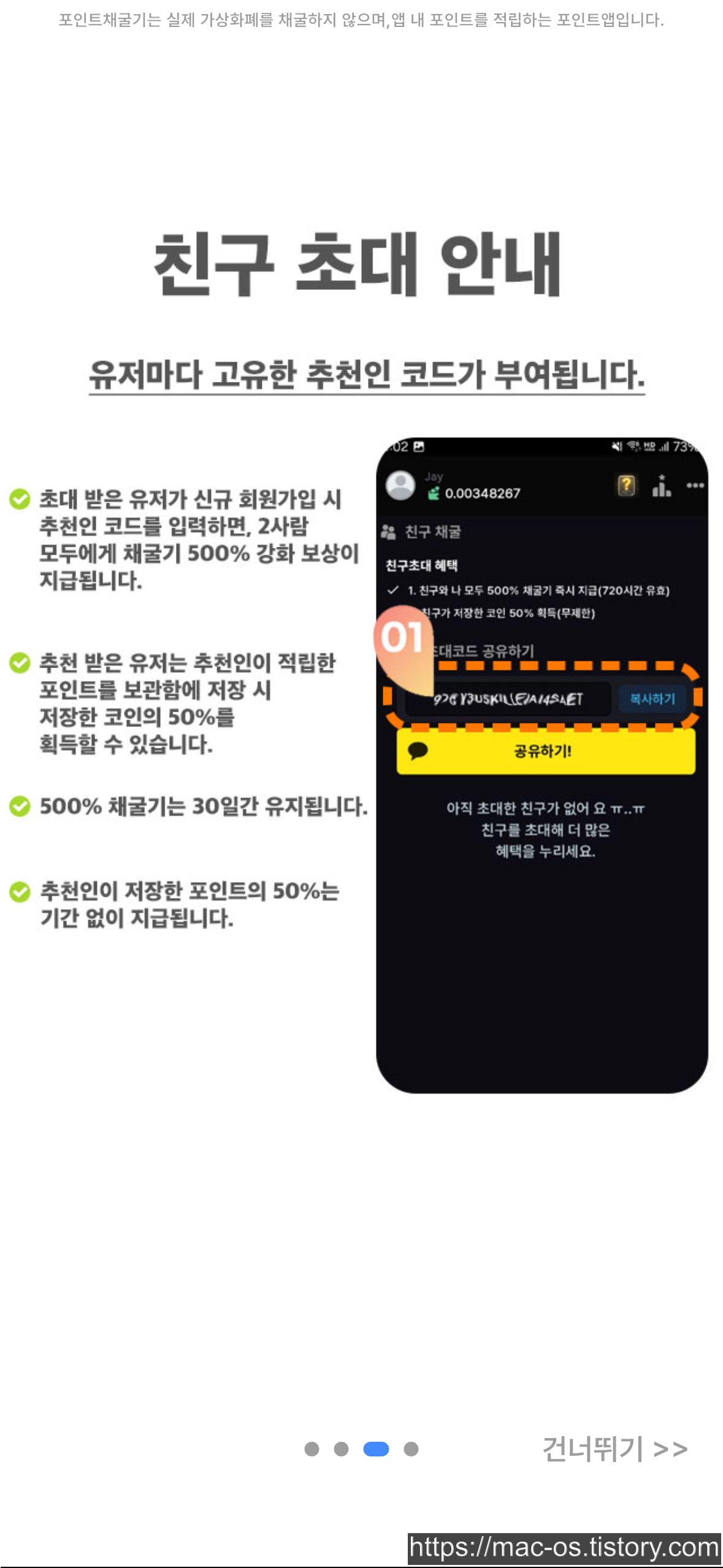 친구가 가입할 때 추천인을 입력하면 친구와 나 모두 500% 채굴기를 얻게 되고, 친구가 저장하는 포인트의 50%를 내가 얻게 됩니다. 여기서 친구가 저장한 포인트는 최대 3회까지 누적되어 보관됩니다.