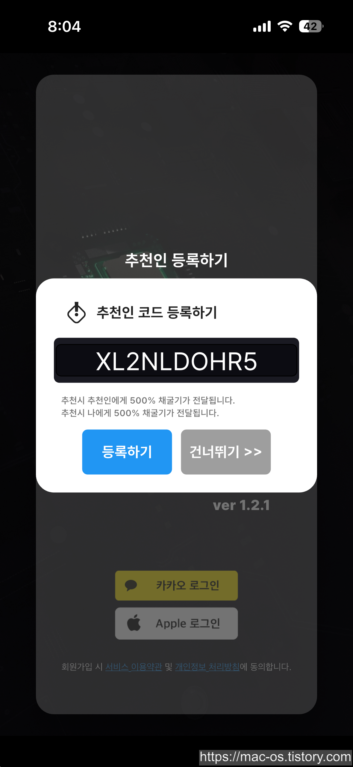가입할 때 추천인 코드를 입력하면 30일간 유효한 500% 채굴기를 얻을 수 있음