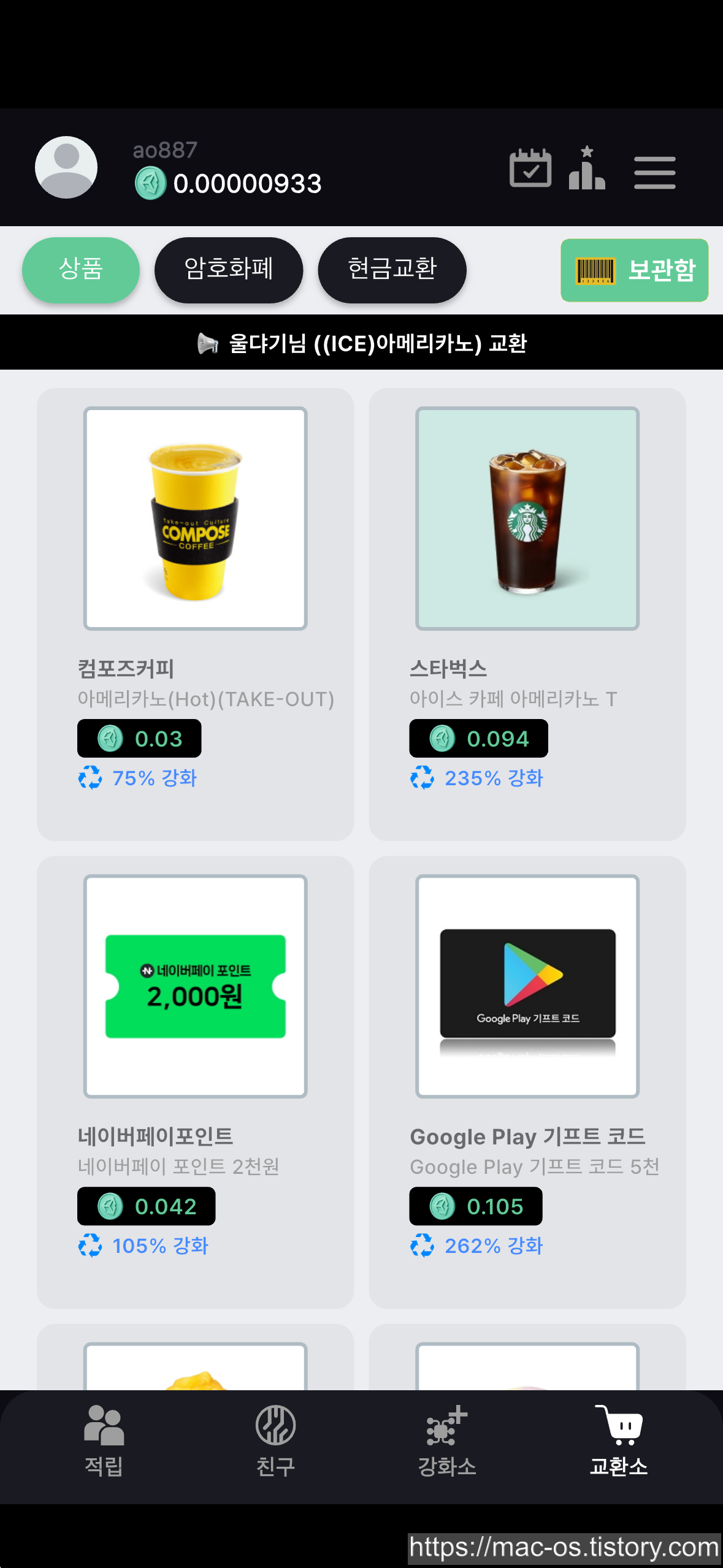 친구를 초대하면 초대자와 친구 모두 500% 채굴기를 받을 수 있고, 얻은 포인트는 현금처럼 사용 가능한 상품권과 여러가지 기프티콘으로 교환 가능합니다.