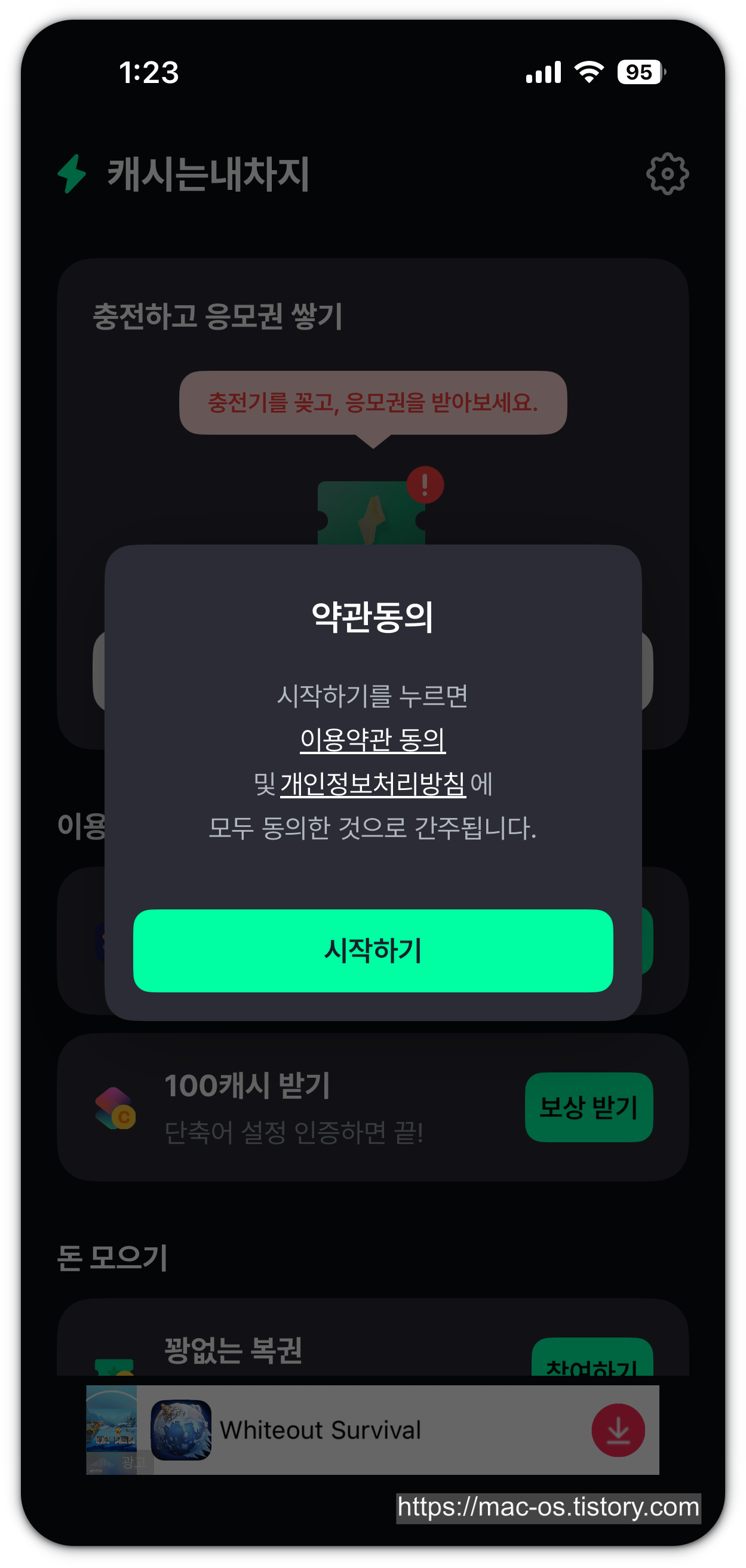 앱스토어에서 캐시는내차지 앱을 설치할 수 있습니다. 앱을 실행하면 약관동의 창이 나오게 되는데, 시작하기 버튼을 눌러줍니다.