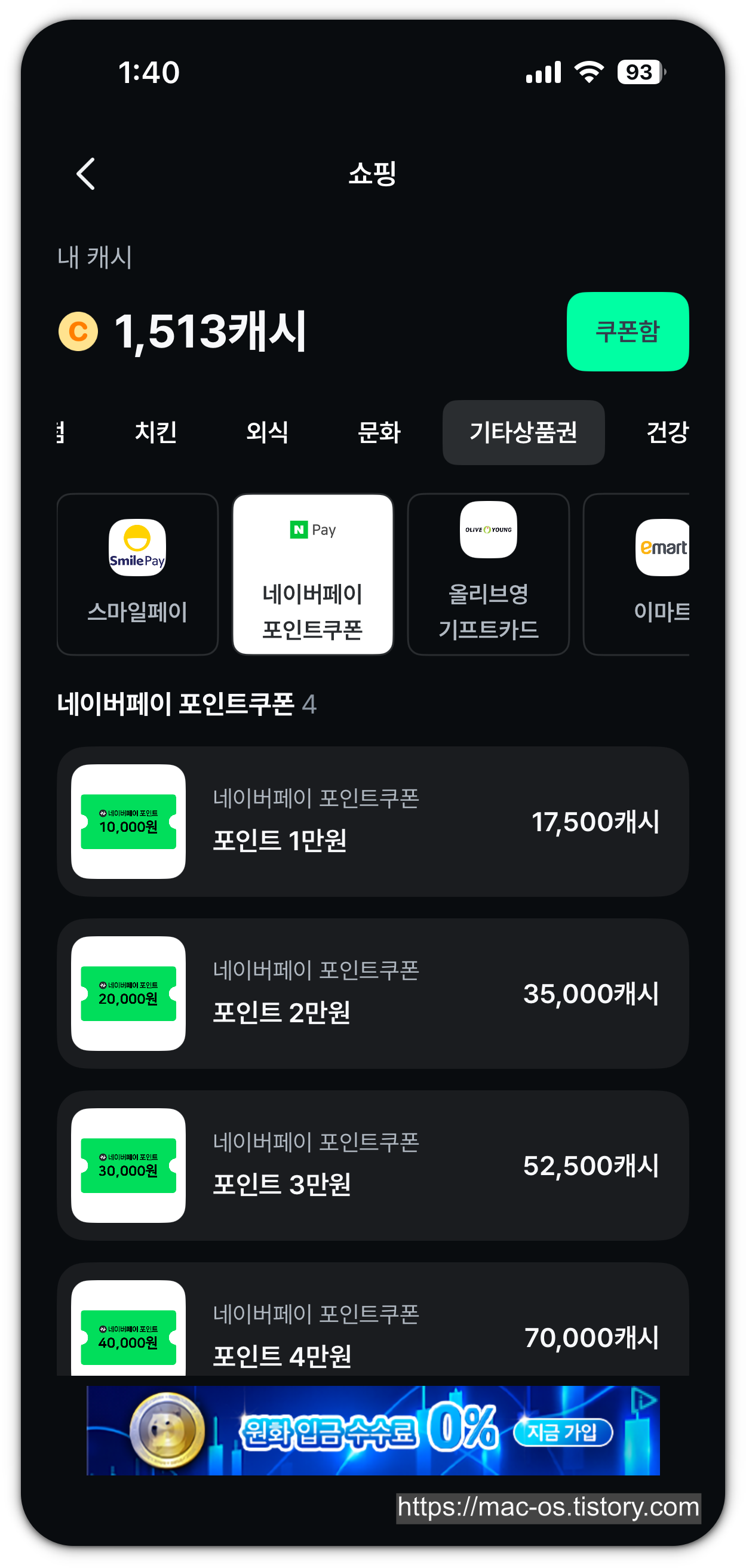 현금 출금 말고도 쇼핑 페이지에서 여러 기프티콘이나 상품권을 구매하는 용도로도 사용이 가능합니다. 여기서는 네이버페이 포인트 1만원을 기준으로 포인트의 가치를 계산해보겠습니다.