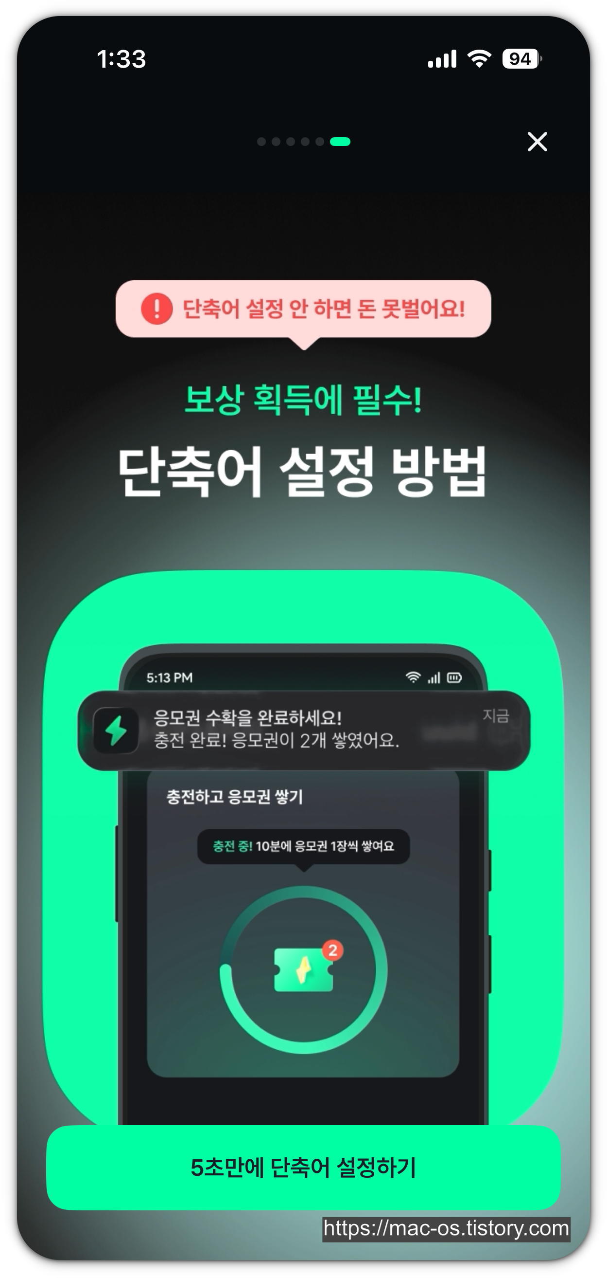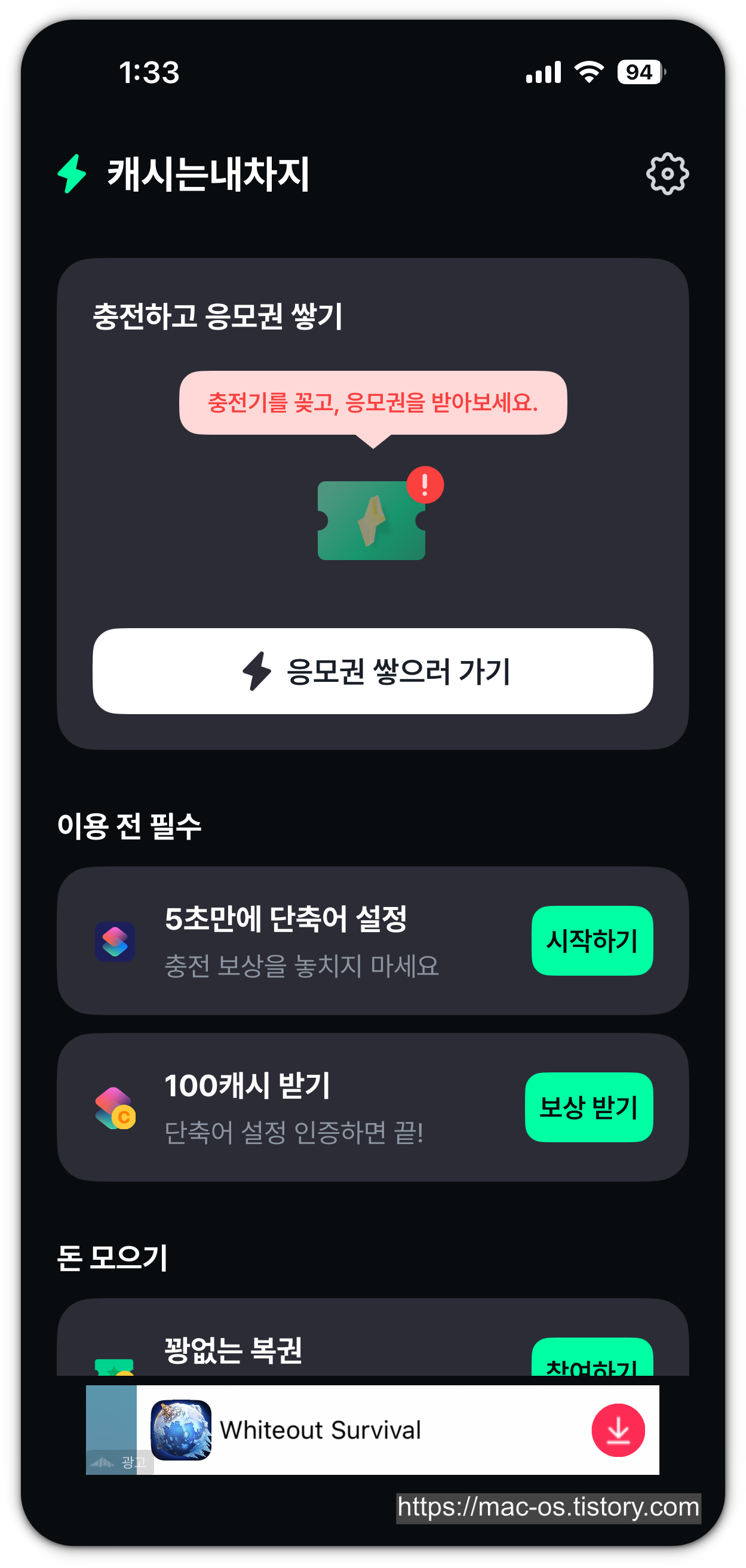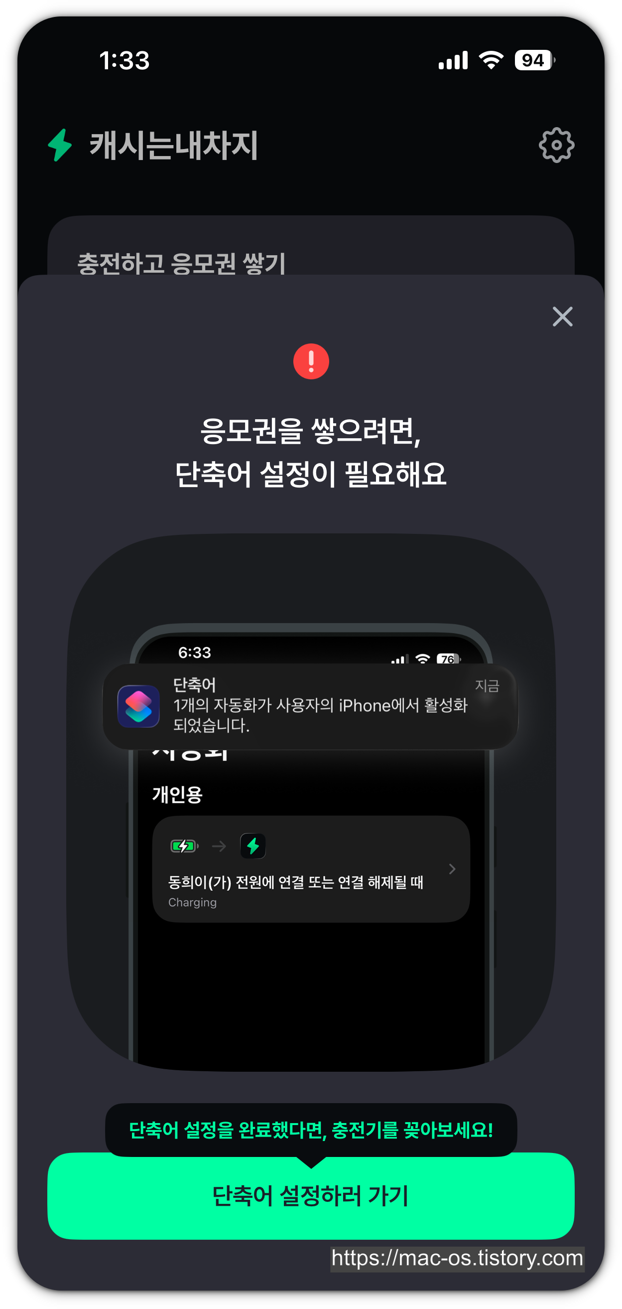 단축어 설정을 완료하고 아이폰에 충전기를 꽂으면 응모권이 적립되기 시작합니다.