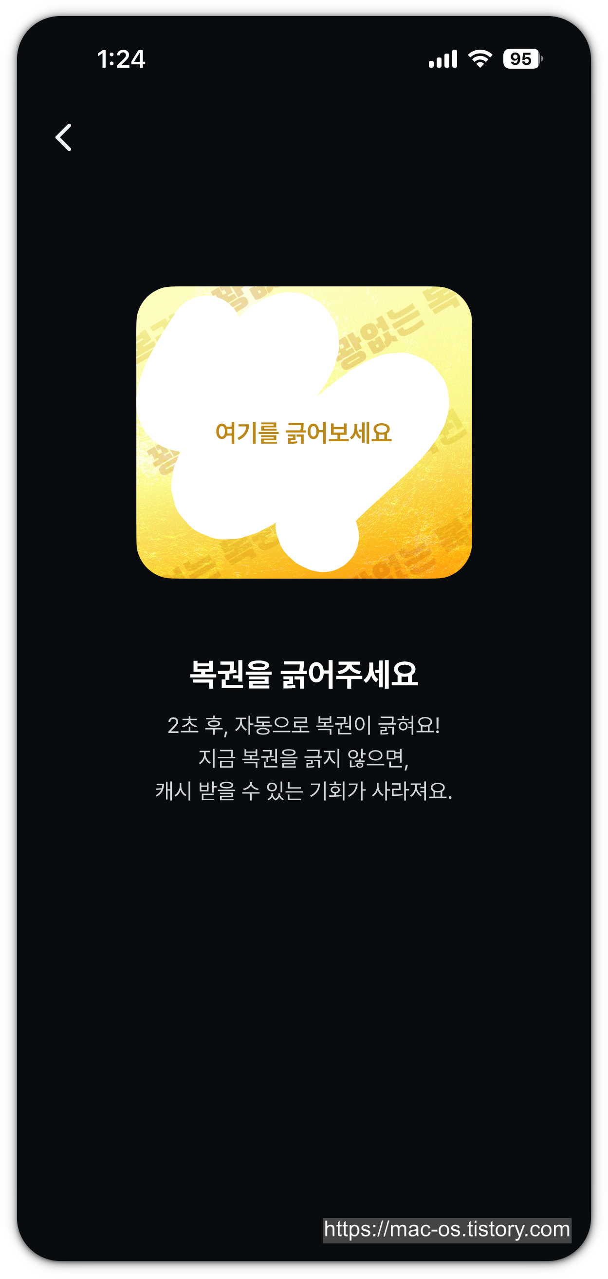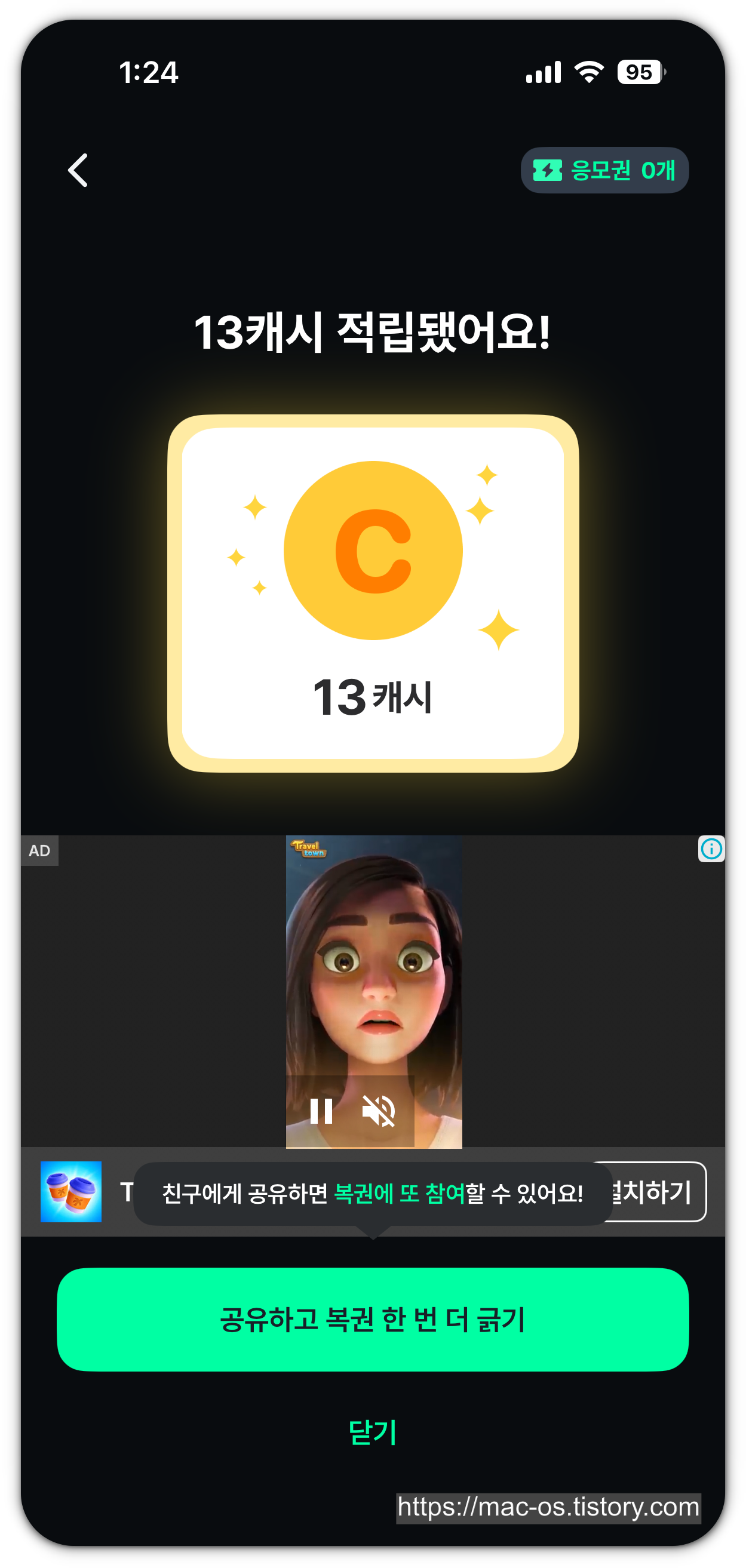 복권을 긁었더니 13캐시가 나왔습니다. 아래의 공유하고 복권 한 번 더 긁기 버튼을 누르면 한번 더 긁을 수 있나보네요.