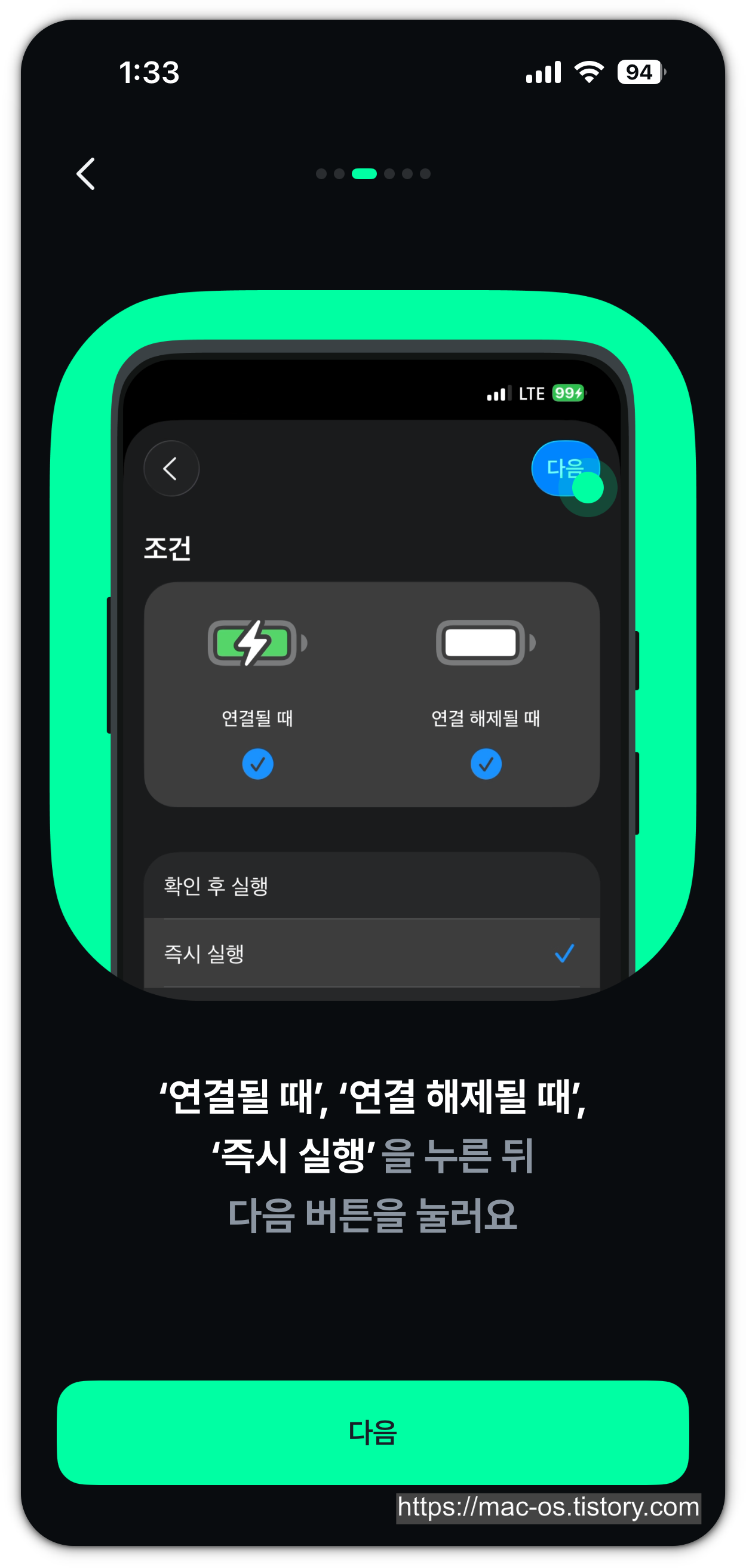 연결될 때, 연결 해제될 때, 즉시 실행을 누른 뒤 다음 버튼을 누릅니다. 그리고 캐시는내차지 버튼과 충전 버튼을 누르면 단축어 설정이 끝납니다.