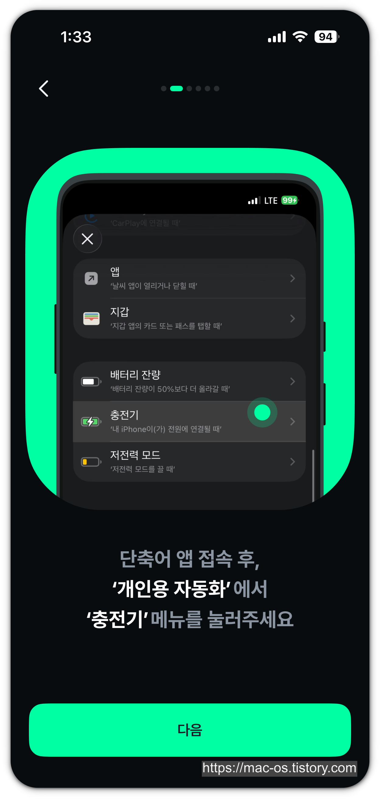 아이폰의 단축어 앱 접속 후 개인용 자동화에서 충전기 메뉴를 눌러줍니다.