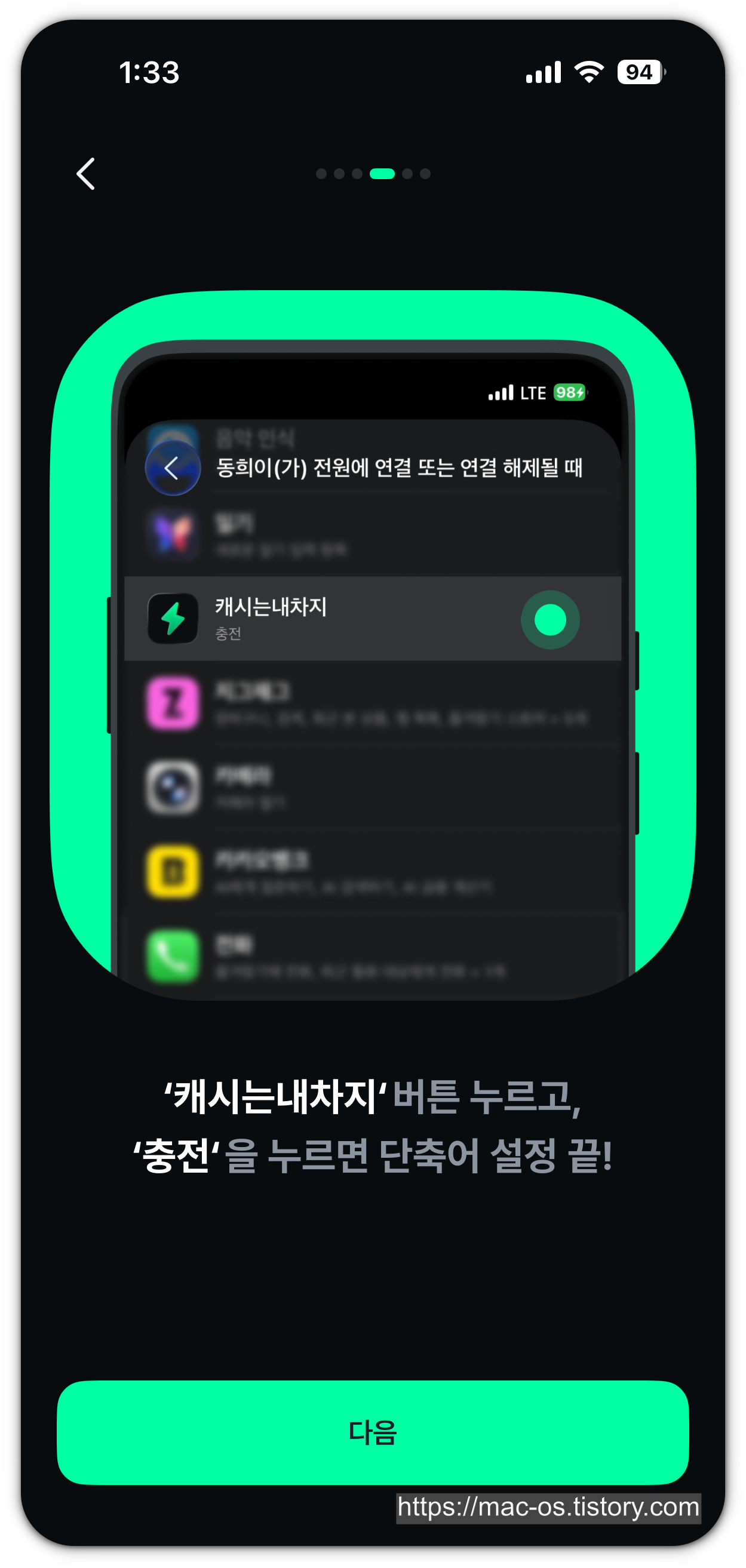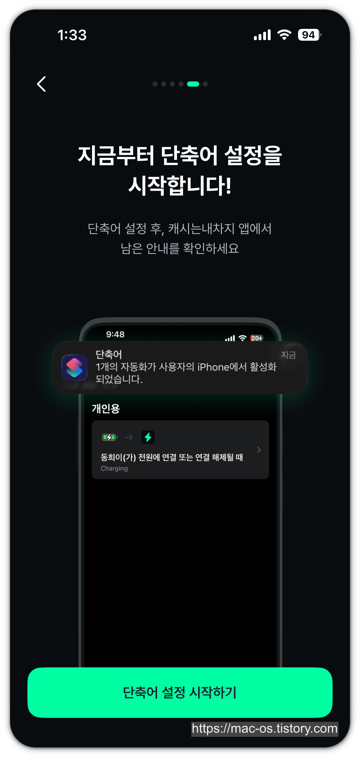 단축어 설정 시작하기 버튼을 누르면 캐시는내차지 앱이 PIP모드로 전환되어 영상을 보면서 단축어 설정을 완료할 수 있습니다.