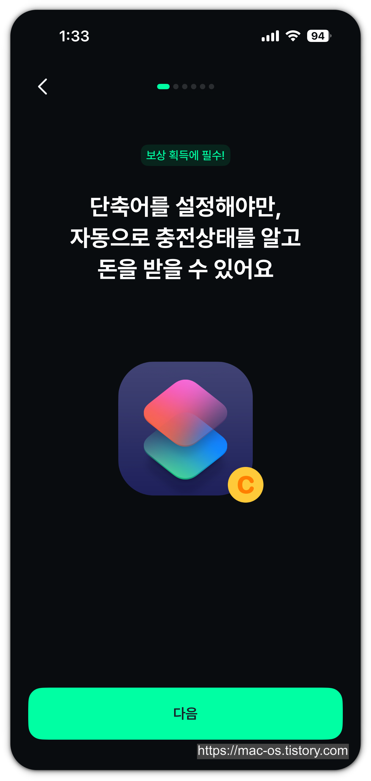 이제 캐시는내차지 앱에서 포인트를 얻는 방법에 대해 소개하겠습니다. 우선 홈 화면에 있는 '5초만에 단축어 설정' [시작하기] 버튼을 눌러 단축어 설정을 어떻게 하는지 방법을 봐야합니다.