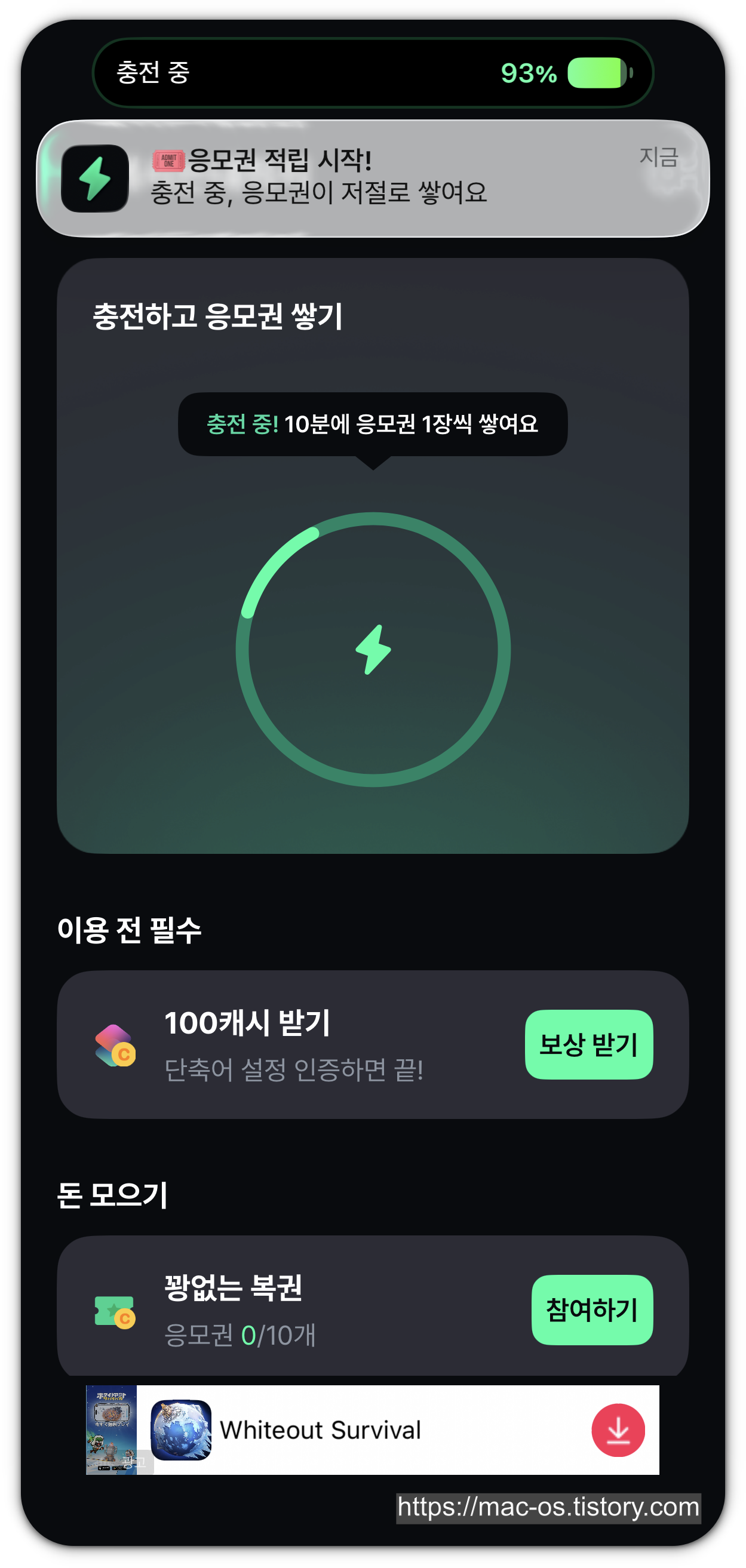 - 휴대폰을 충전하면 10분마다 응모권 1장이 쌓이는데, 응모권 10장으로 꽝없는 복권 긁기에 1회 도전 가능