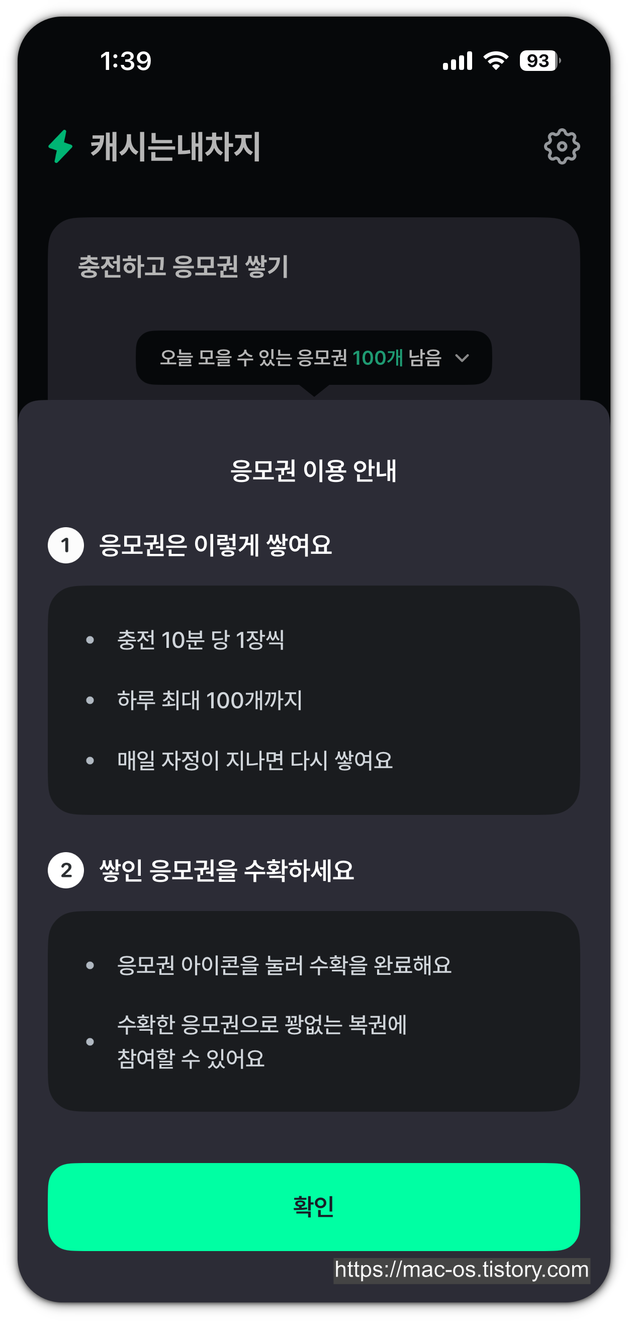 충전시간 10분에 응모권 1장이 쌓이므로, 만약 사람이 자는 시간 8시간(480분)동안 충전기를 꽂아둔다면 응모권 48개가 쌓이게 됩니다. 이를 계산하면 62.4캐시(35.57원)입니다.