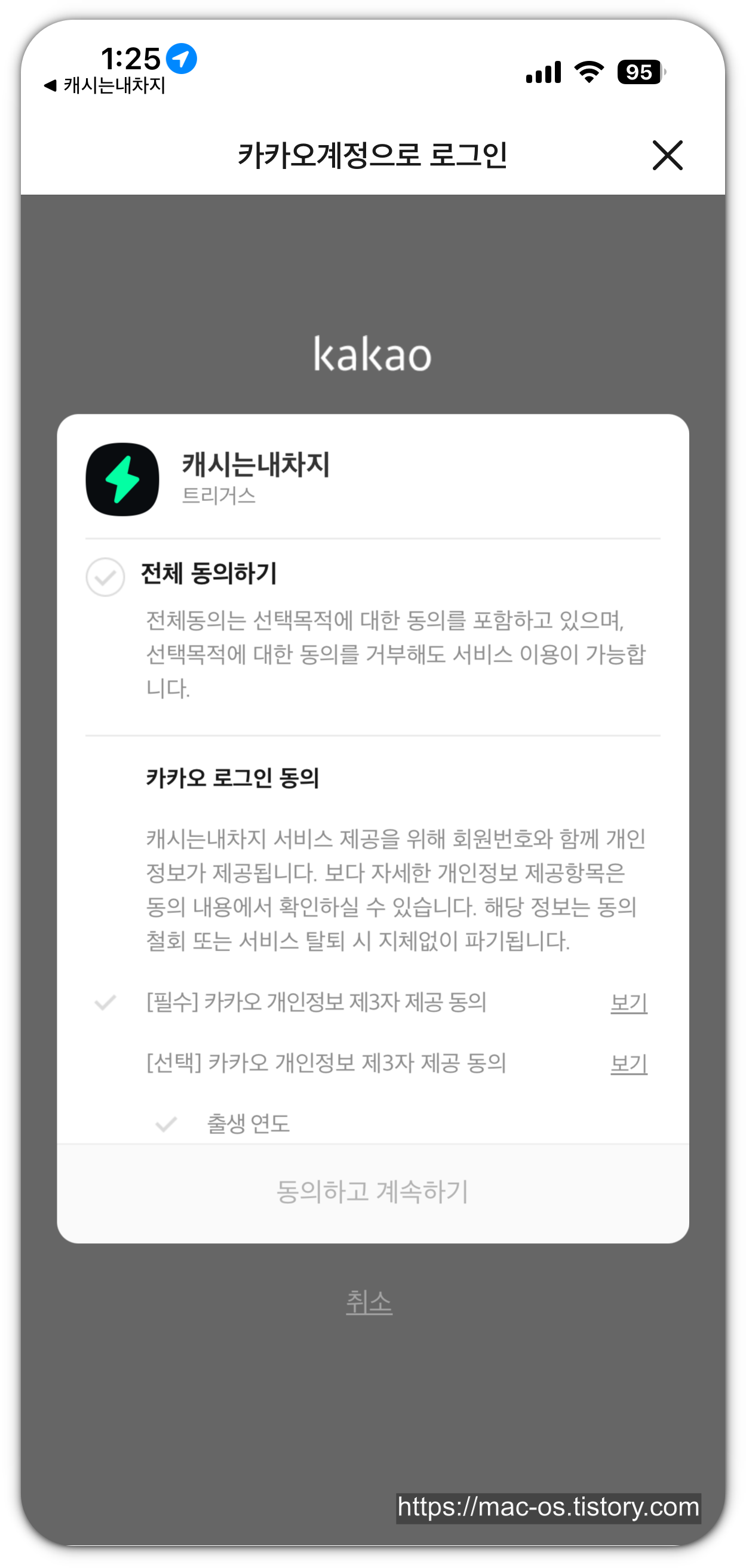 캐시는내차지 홈 화면에서 아래로 스크롤을 내리면 1,500캐시 즉시 받기 항목이 있습니다. 여기서 [보상받기] 버튼을 누르면 카카오, 애플 계정으로 로그인하여 가입할 수 있습니다. 저는 카카오 계정으로 가입을 진행했습니다.