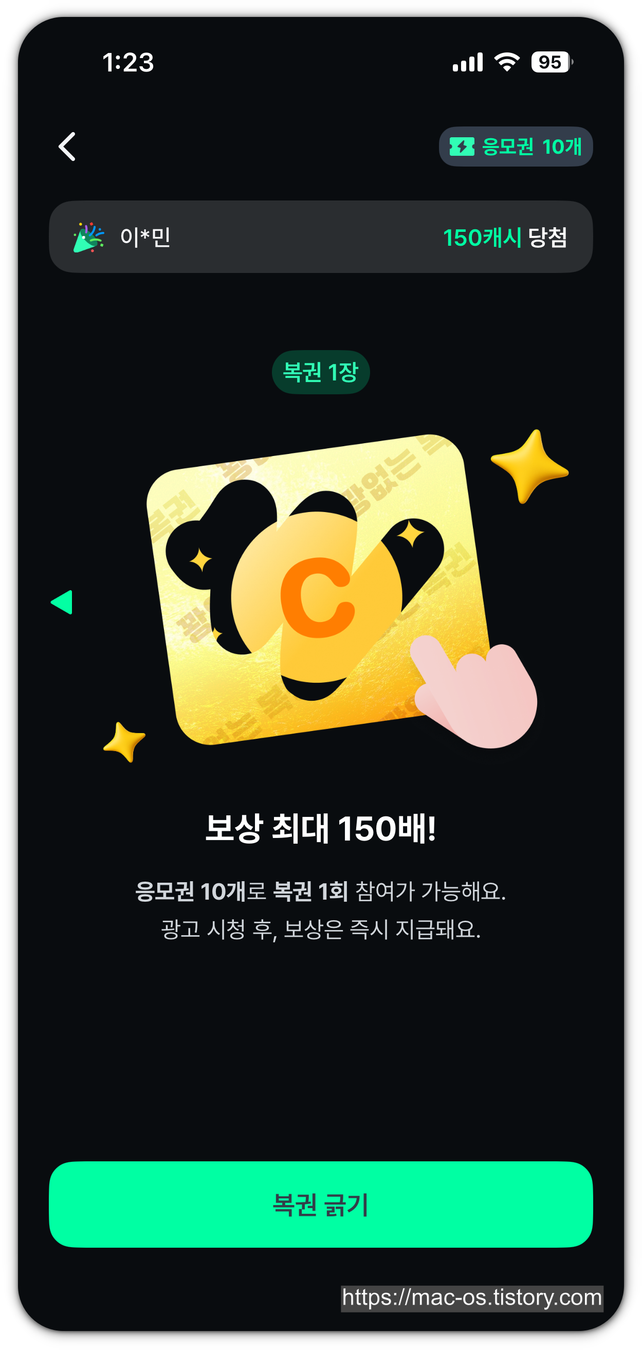 응모권은 충전 10분당 1개씩, 하루 최대 100개씩, 매일 자정이 지나면 얻을 수 있는 개수가 초기화됩니다. 응모권 아이콘을 눌러 수확을 완료하면 됩니다. 그리고 응모권 10개를 사용해 1회 복권을 긁는 식입니다. 이렇게 복권을 긁고 얻은 캐시는 현금 교환하기 페이지에서 현금으로 출금할 수 있습니다.