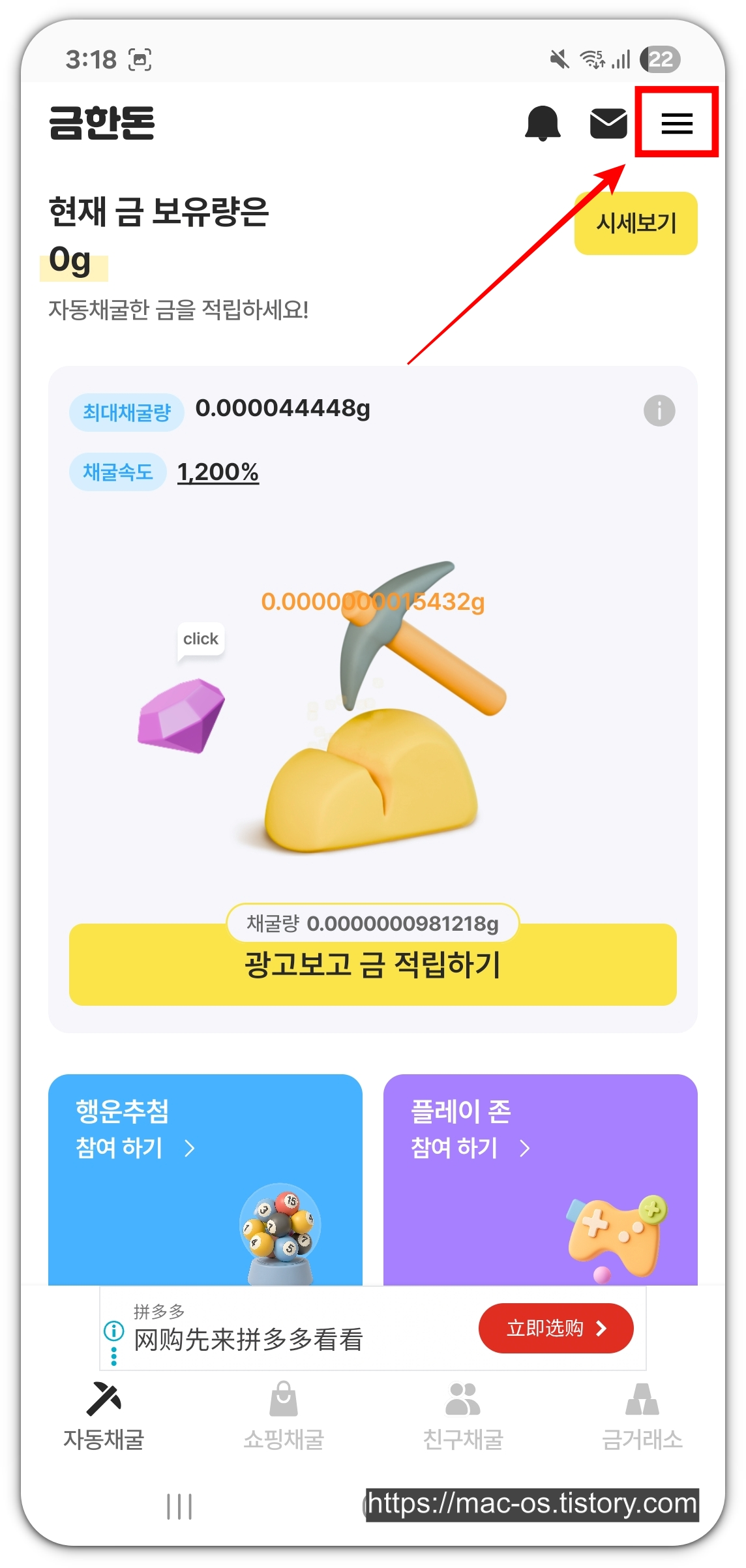 자동채굴 탭에서는 자동으로 금이 1초마다 캐지면서 누적됩니다. [광고보고 금 적립하기] 버튼을 누르면 누적된 금을 저장할 수 있습니다. 최대 채굴량 제한이 있어서 매일마다 생각날 때 한번씩 저장해줘야 하는 것 같네요.