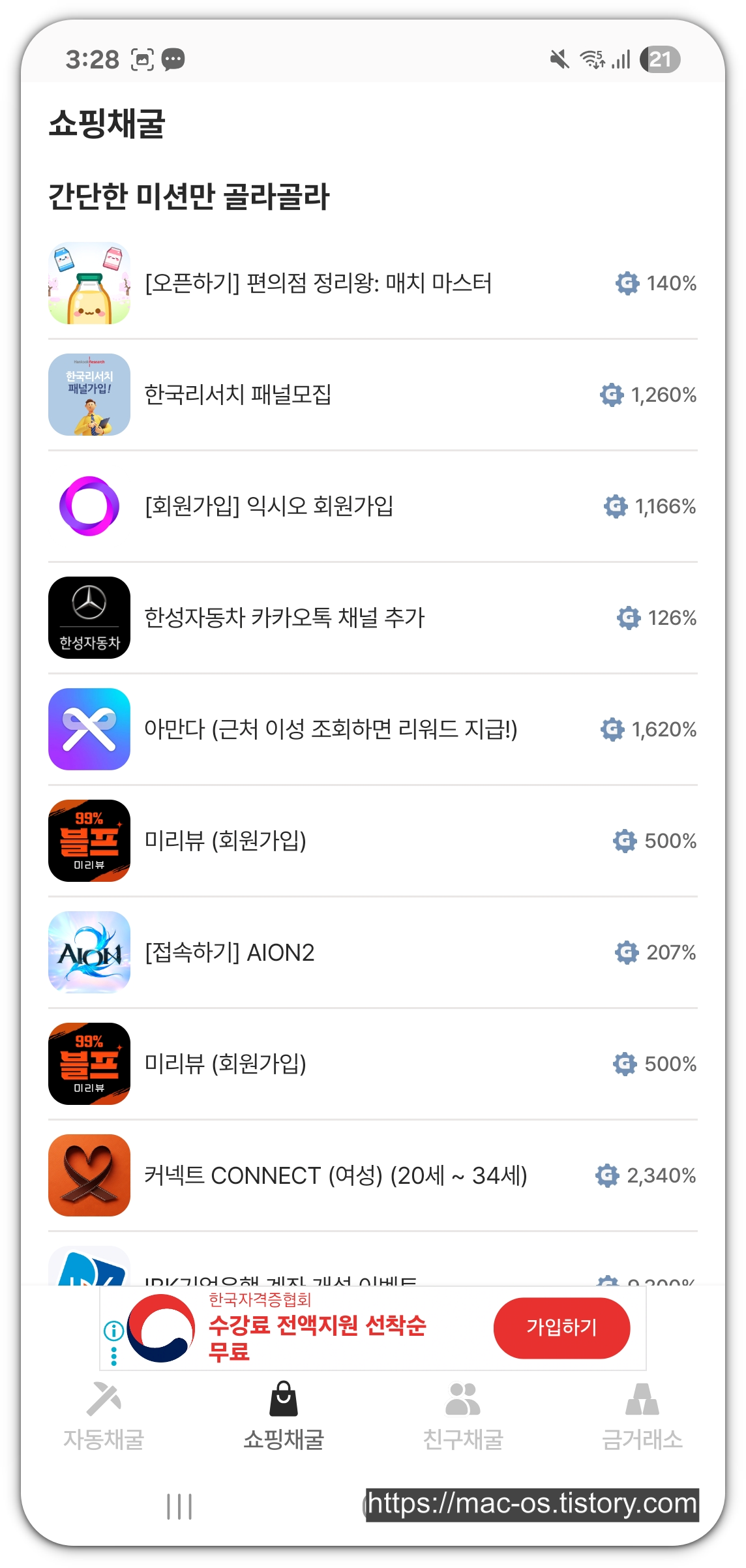 쇼핑채굴 탭에서 간단한 미션을 한눈에 볼 수 있고, 여기서도 광고에 참여하고 보상으로 가속기를 받을 수 있습니다.