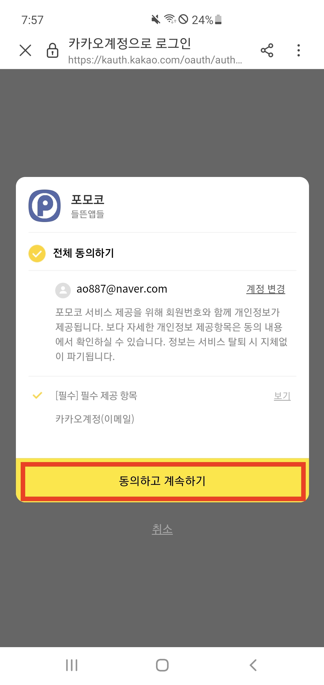 앱을 실행하면 카카오 계정으로 로그인할 수 있는데 여기서 몇 가지 동의해주면 된다.
