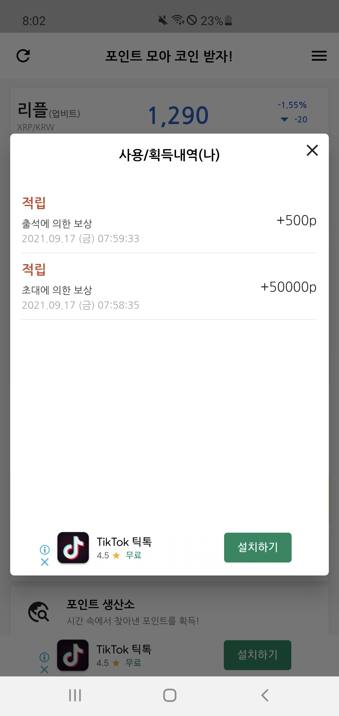 출석체크, 광고 시청 등으로 얻은 p(포인트)는 평일 일정 시간이 되면 자동으로 리플(XRP)로 변환되며 이렇게 얻은 XRP를 거래소 지갑 주소로 보낼 수 있다.