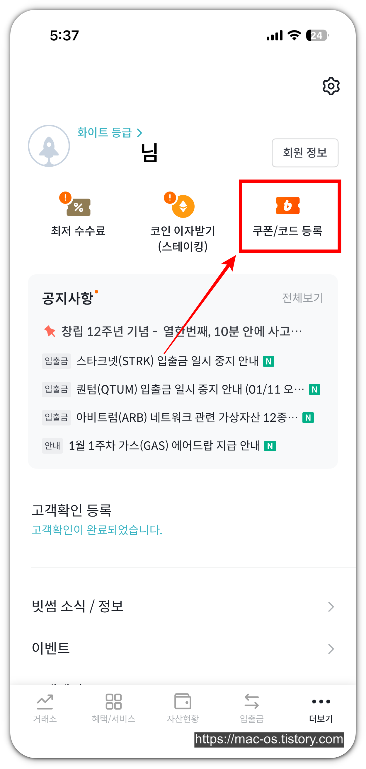 - 더보기 페이지에서 우측 상단 [쿠폰/코드 등록]을 터치합니다.