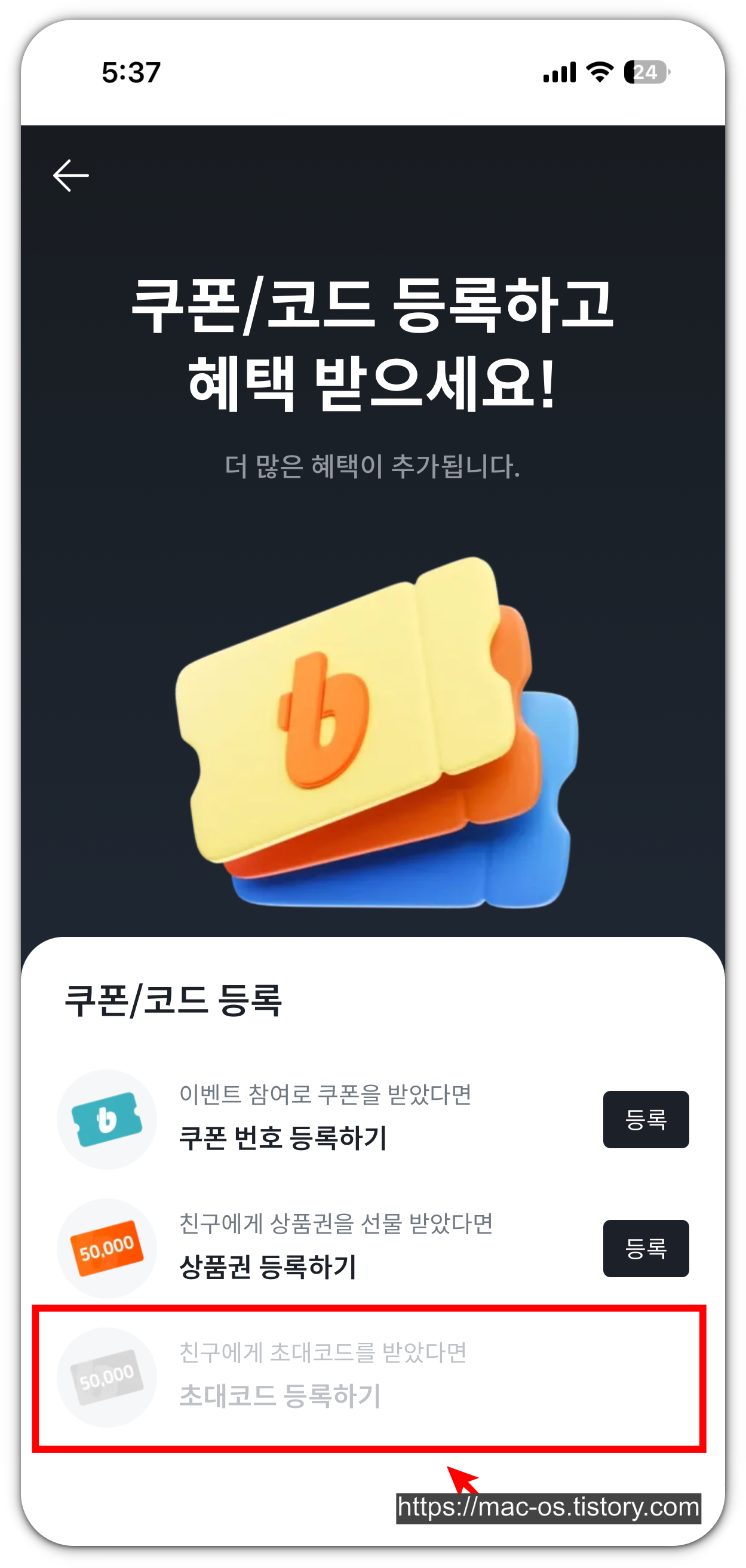 - 세번째에 있는 [초대코드 등록하기]를 터치합니다.