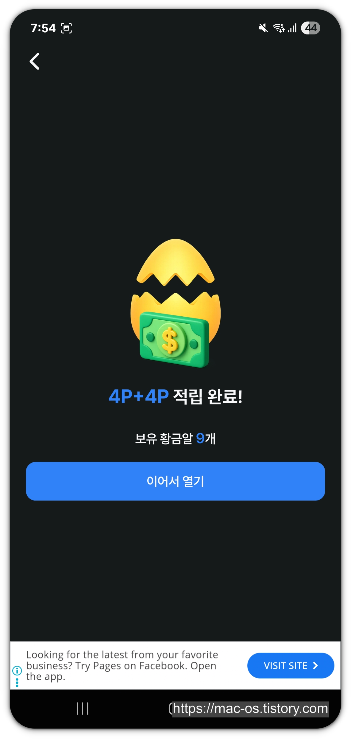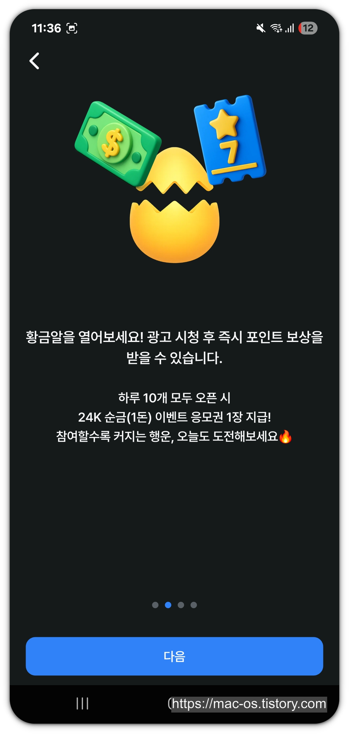 즉시 개봉 버튼을 누르면 영상 광고가 30초 정도 나옵니다. 이걸 다보면 알을 개봉하게 되는데, 저는 한번 해보니 8포인트를 받았습니다. 이걸 하루에 10번 꾸준히 하고 돈을 모으는 방식인 것 같습니다.