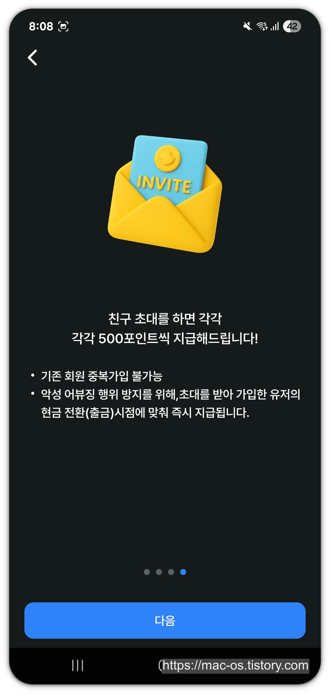 회원가입을 마치고 아래를 보시면 [친구초대 이벤트]가 있는데요. 여기서 [초대하기] 버튼을 터치합니다.