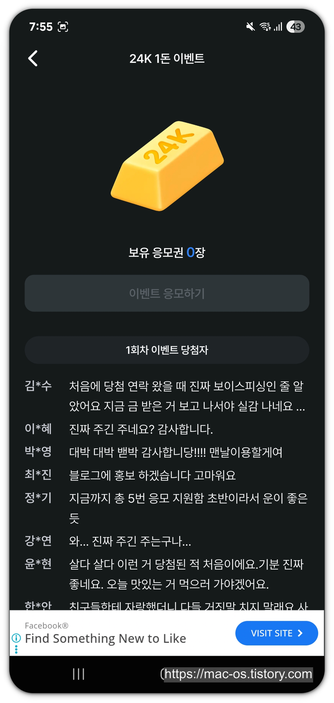 아까 알을 10번 모두 깨면 이벤트 응모권 1장을 줍니다. 24K 1돈 이벤트 페이지에서 응모하기 버튼을 눌러 참여할 수 있습니다. 여기에 당첨자 후기도 적혀있네요.