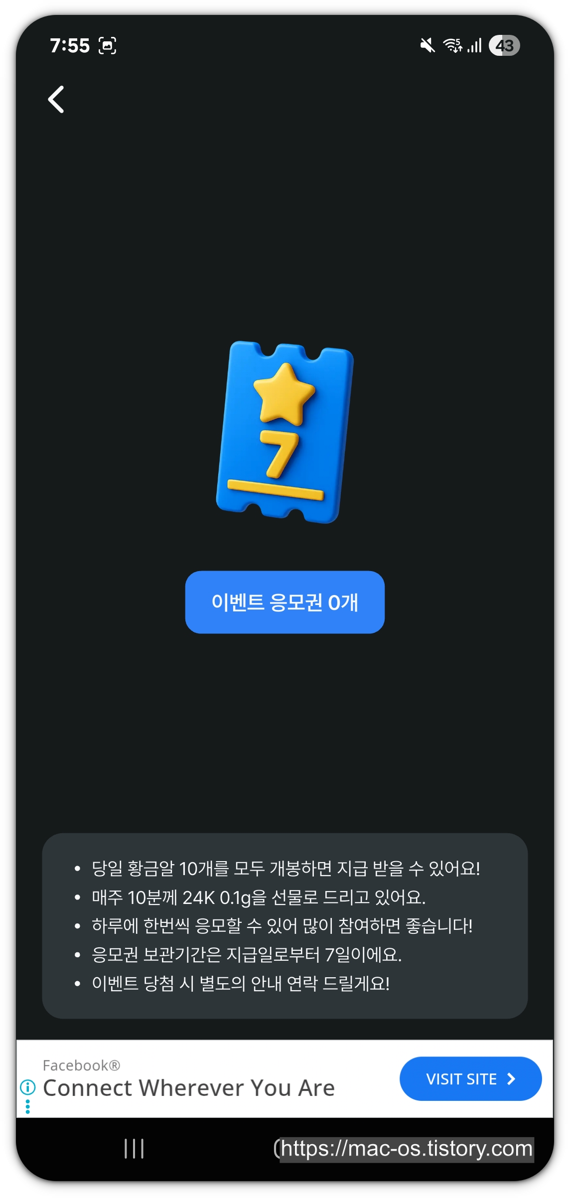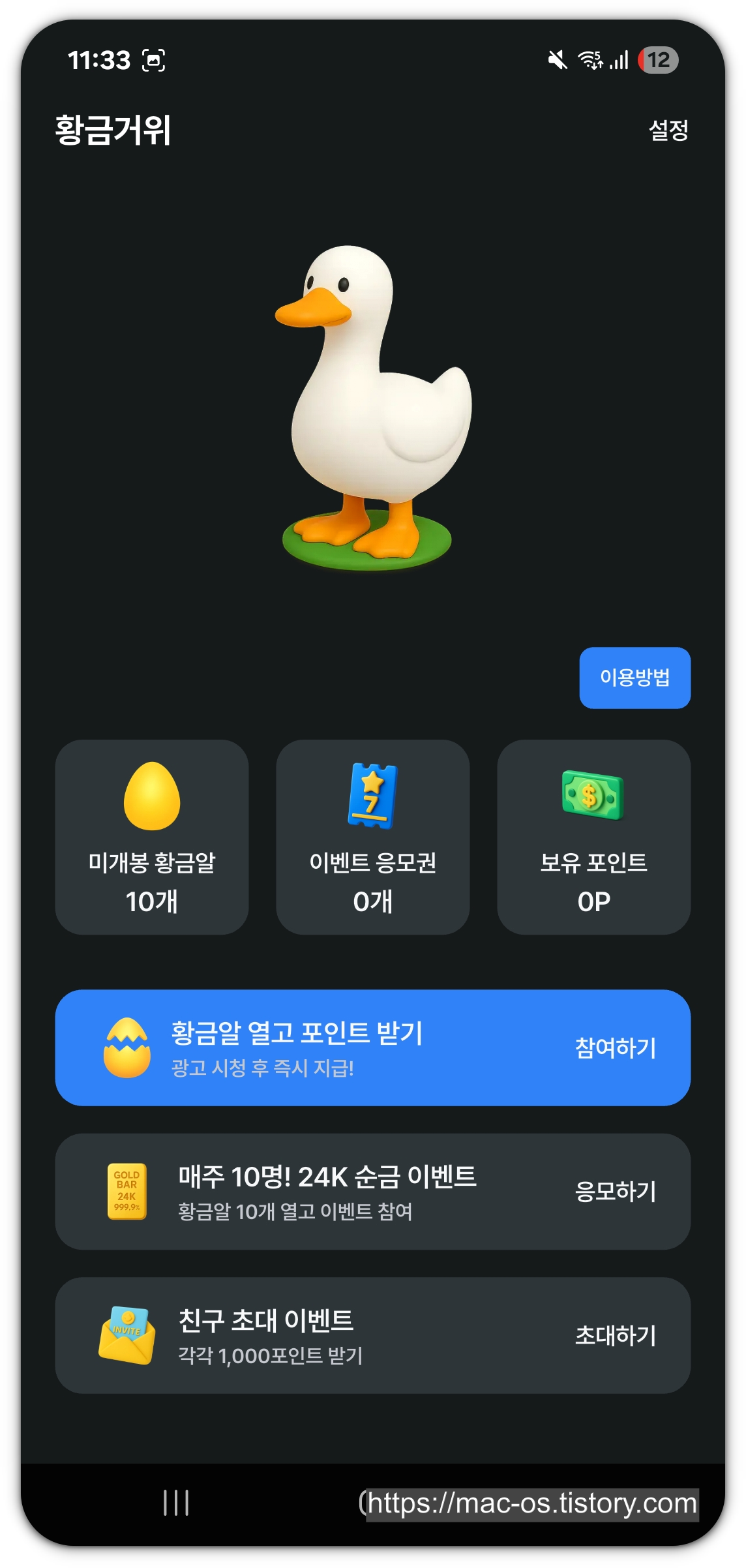 - 매일 황금알 10개 개봉: 30초 내외의 광고 시청 후 알을 깨면 포인트를 획득하며, 10개를 모두 모으면 순금 1돈 응모권 1장을 지급합니다.
