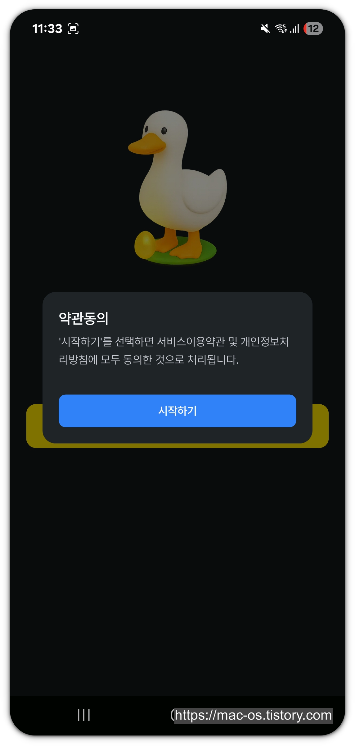 카카오 로그인을 하고 나면 약관동의 창이 나오는데, 시작하기 버튼을 터치해줍니다.