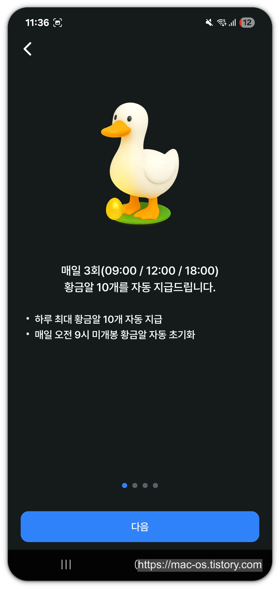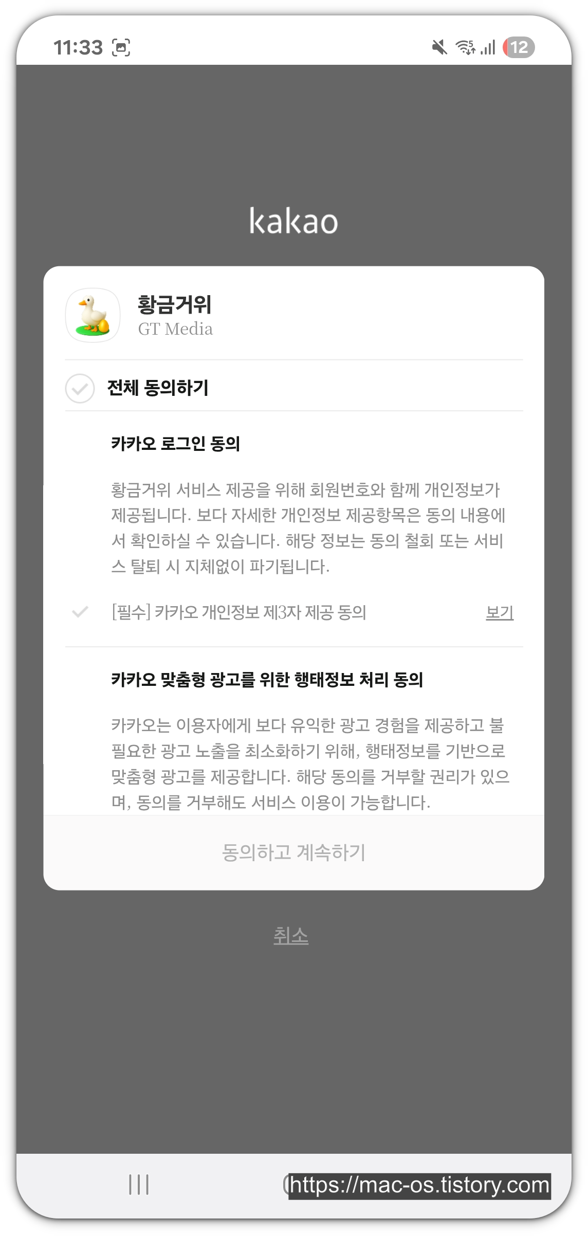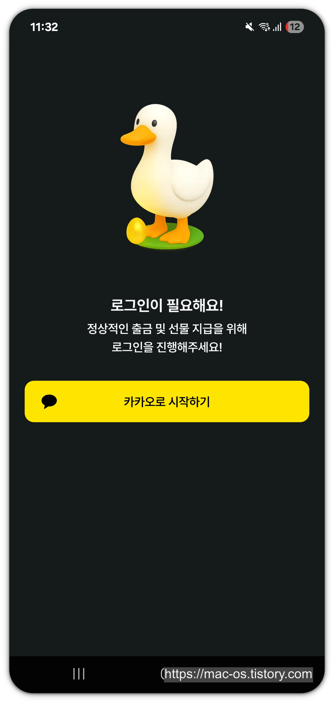 황금거위는 구글 플레이 스토어와 앱스토어에서 설치할 수 있습니다. 카카오로 시작하기 버튼을 눌러 로그인합니다.