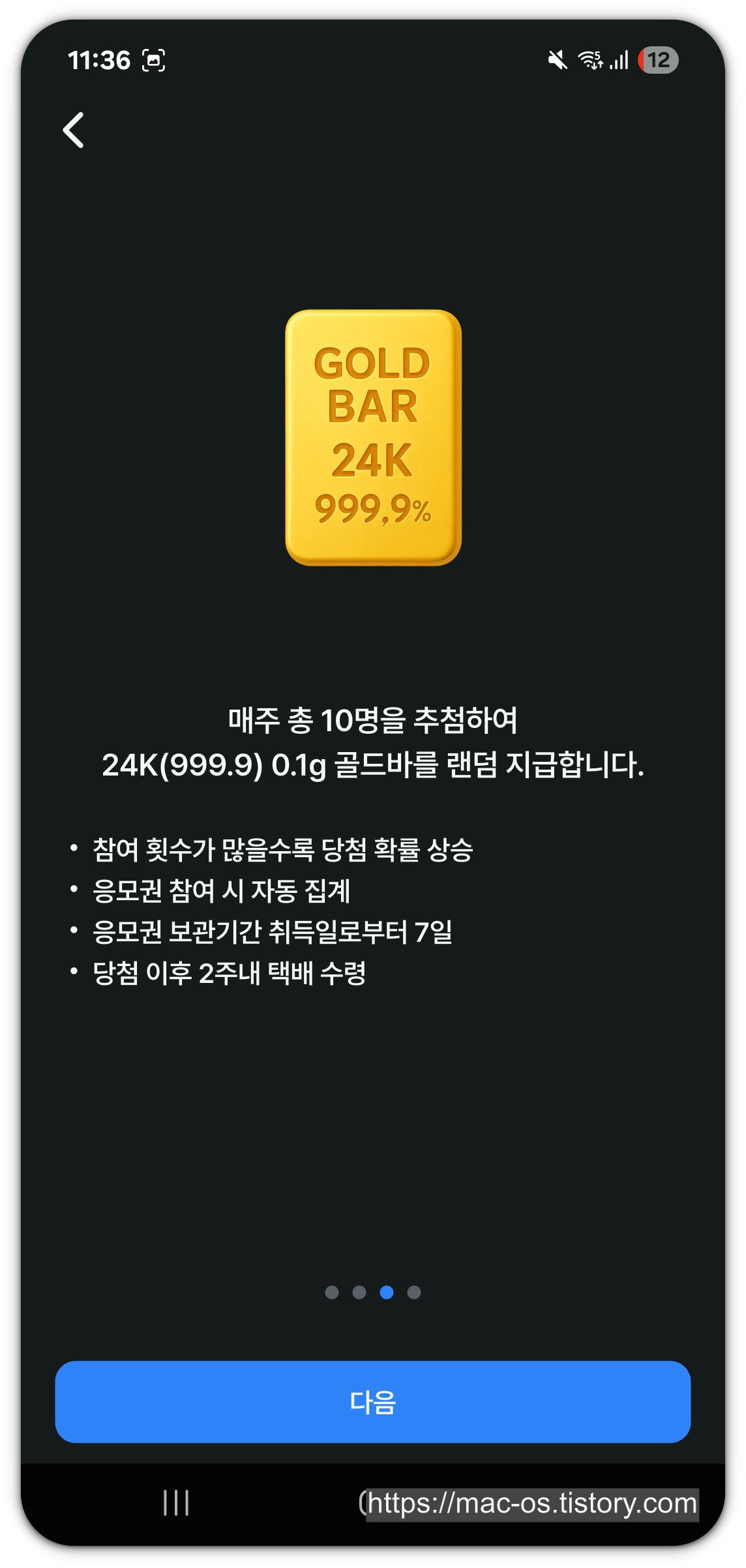 - 실물 골드바 당첨 기회: 포인트 적립 외에도 매주 추첨을 통해 총 10명에게 24K 0.1g 골드바를 증정하는 경품 이벤트를 운영합니다.
