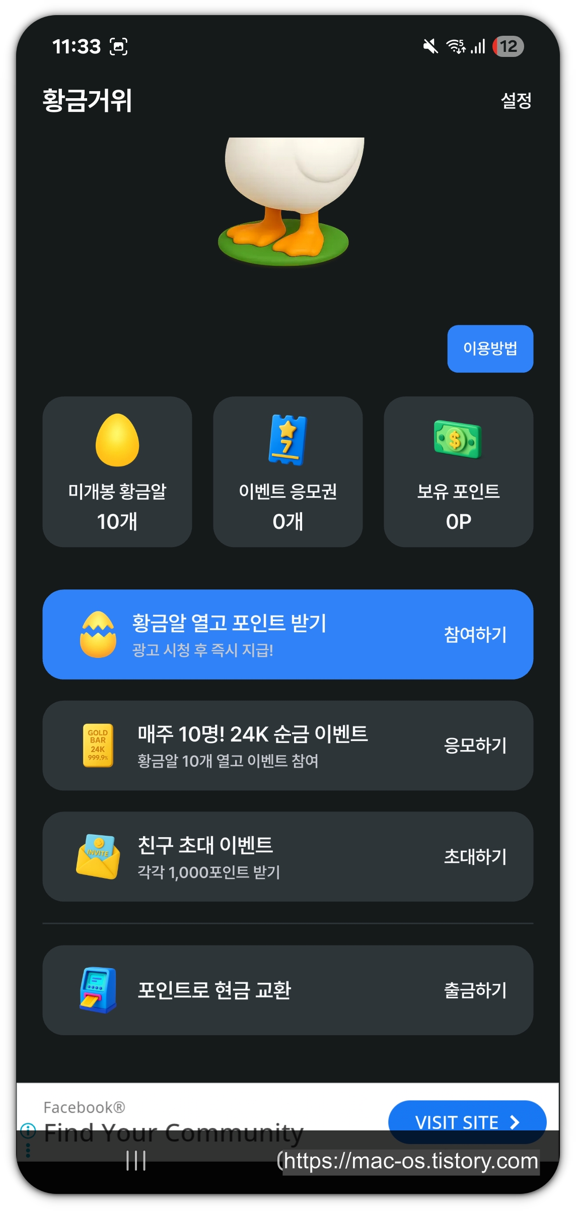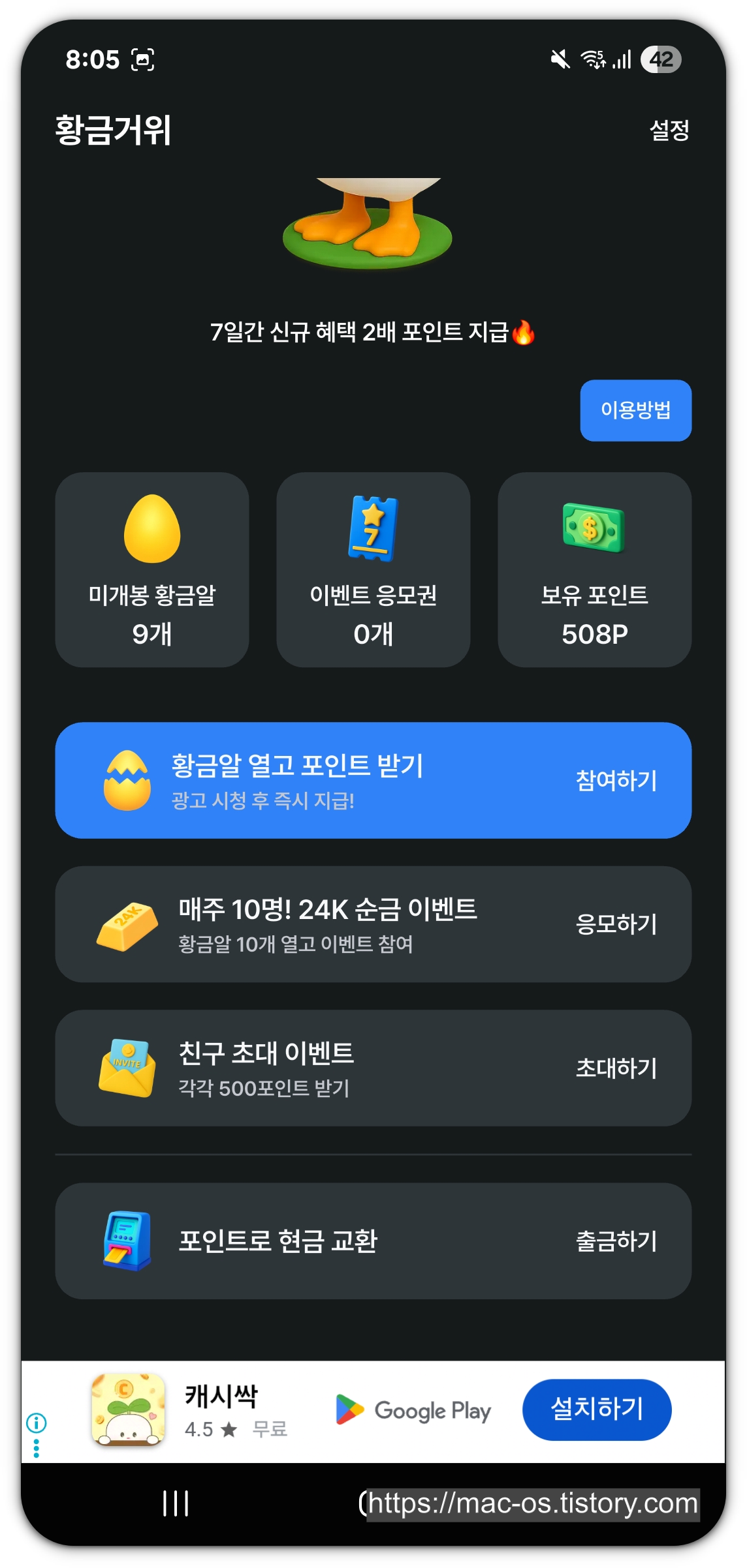 홈 화면에서 [출금하기] 버튼을 터치하면 황금알 개봉으로 얻은 포인트를 1:1 비율로 출금할 수 있습니다. 2천 포인트부터 출금할 수 있네요.
