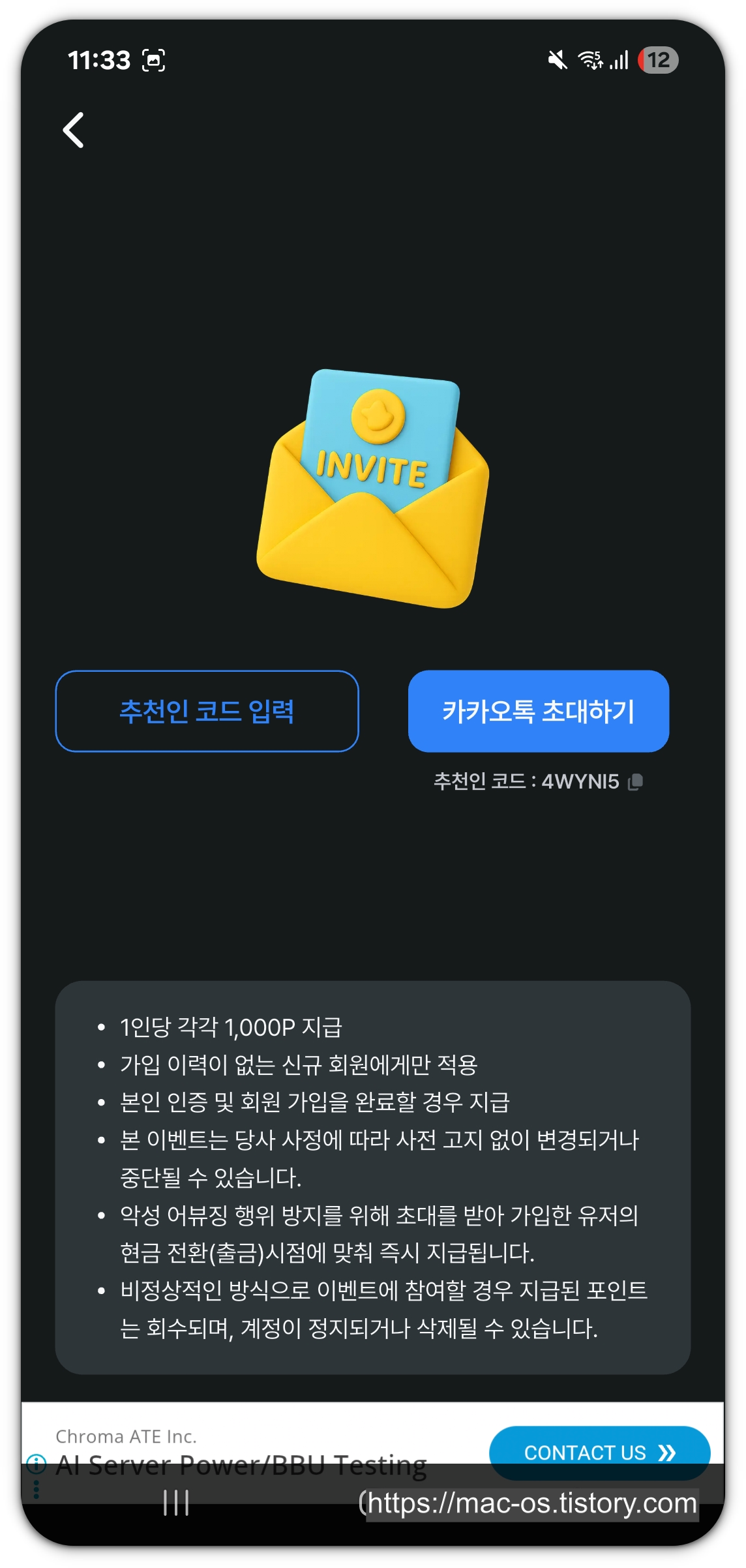 친구초대 페이지에서 [추천인 코드 입력] 버튼을 누르고 추천인 코드 칸에 4WYNI5를 복사해서 입력하면 500포인트를 받으실 수 있습니다.