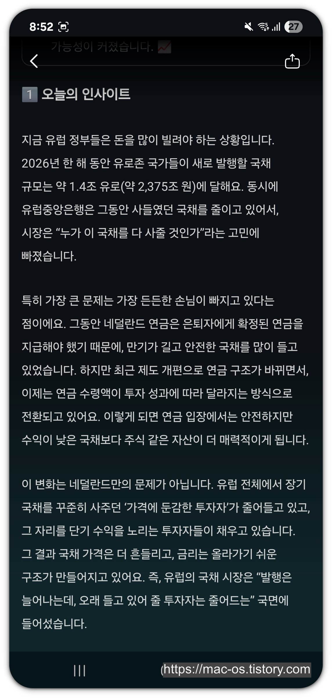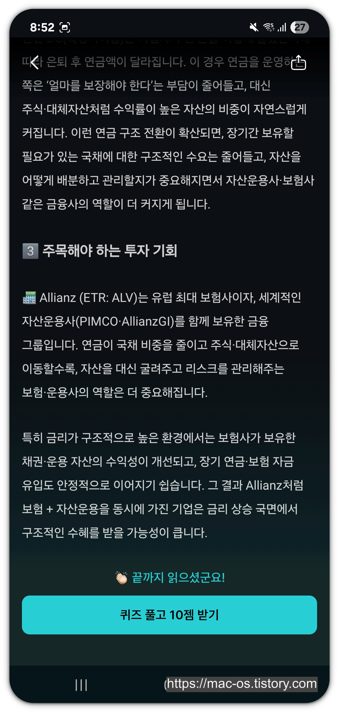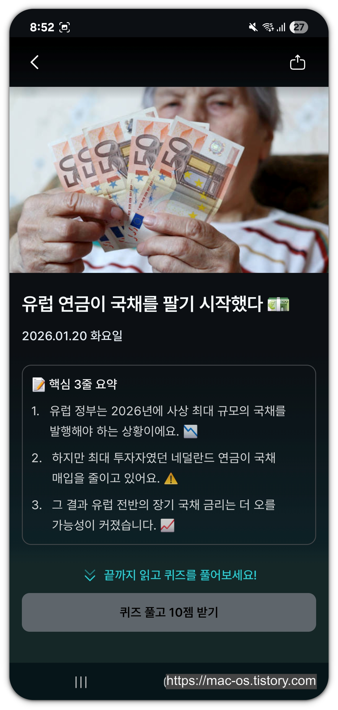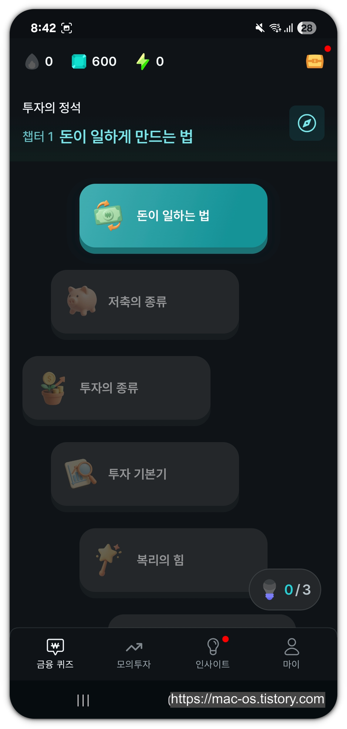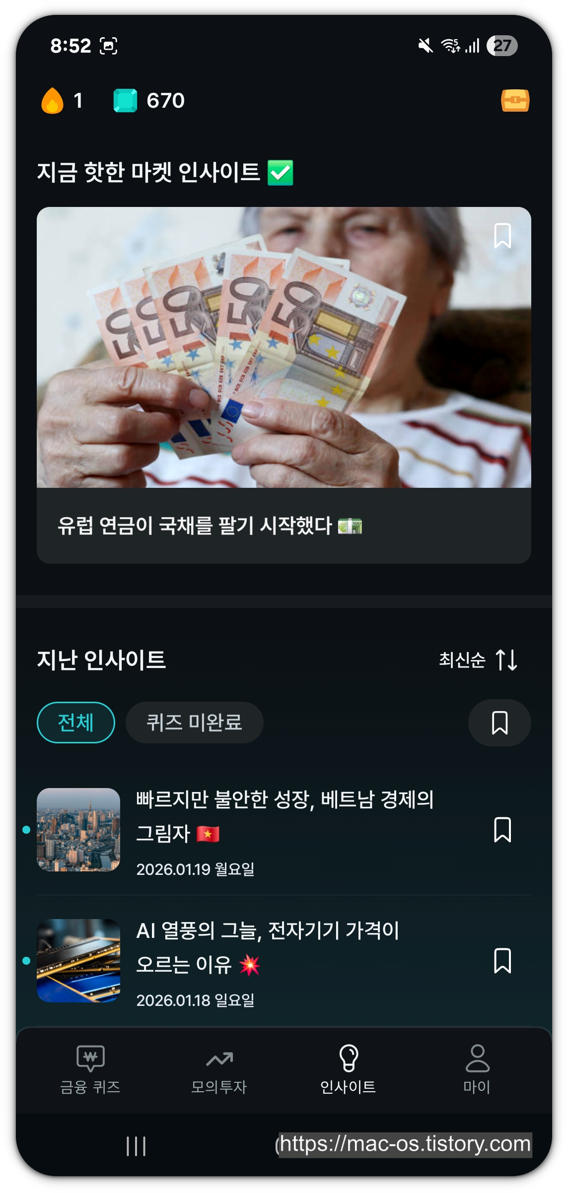인사이트에선 최근 경제 뉴스를 읽고, 퀴즈를 풀면 젬을 받을 수 있습니다. 핵심 3줄 요약이 있어서 글을 한눈에 파악하기 좋습니다.
