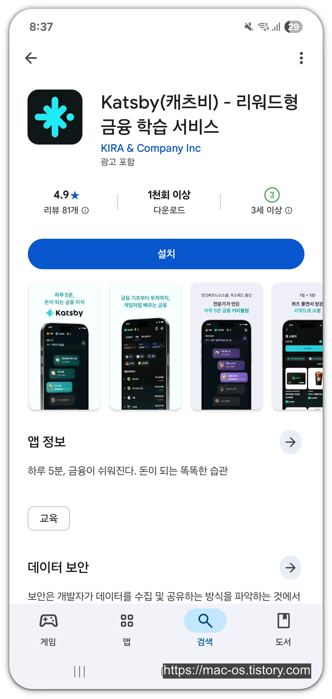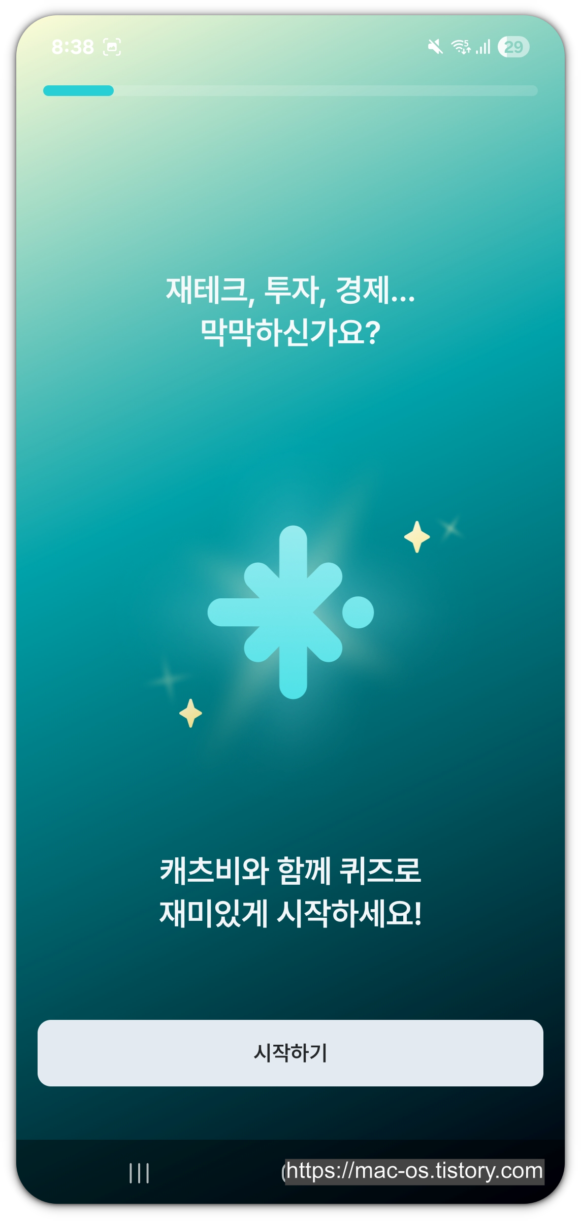 캐츠비는 구글 플레이 스토어에서 설치하실 수 있습니다. 앱을 실행하고 [시작하기] 버튼을 누릅니다.
